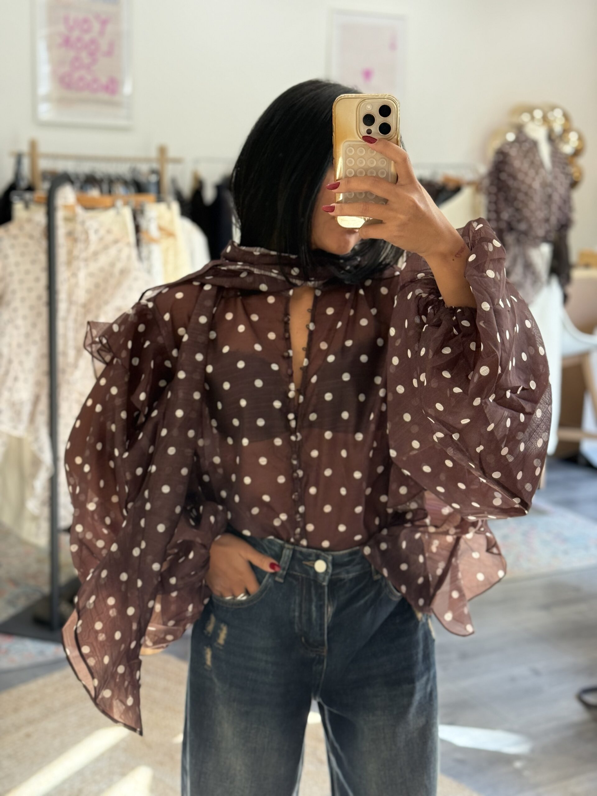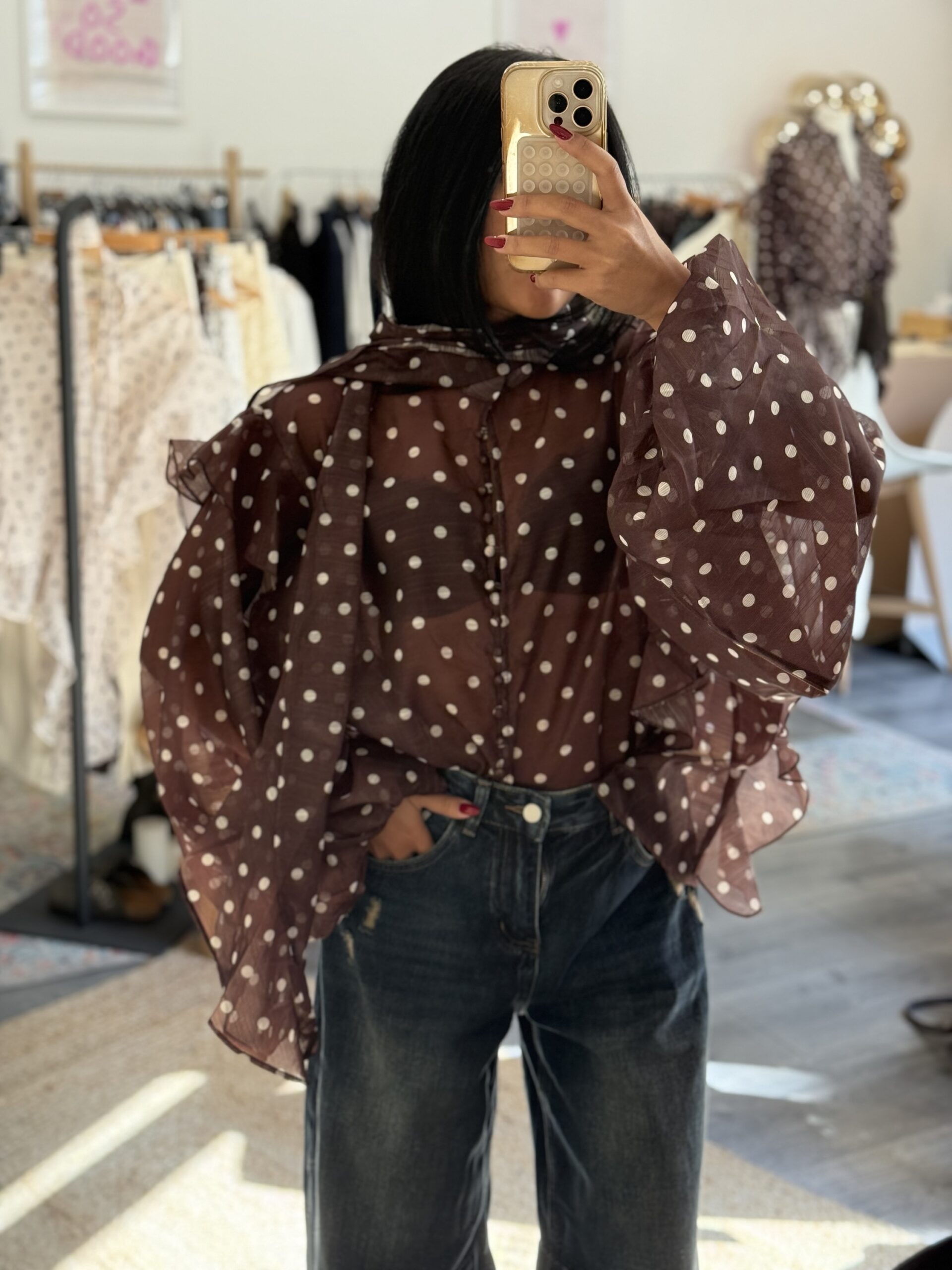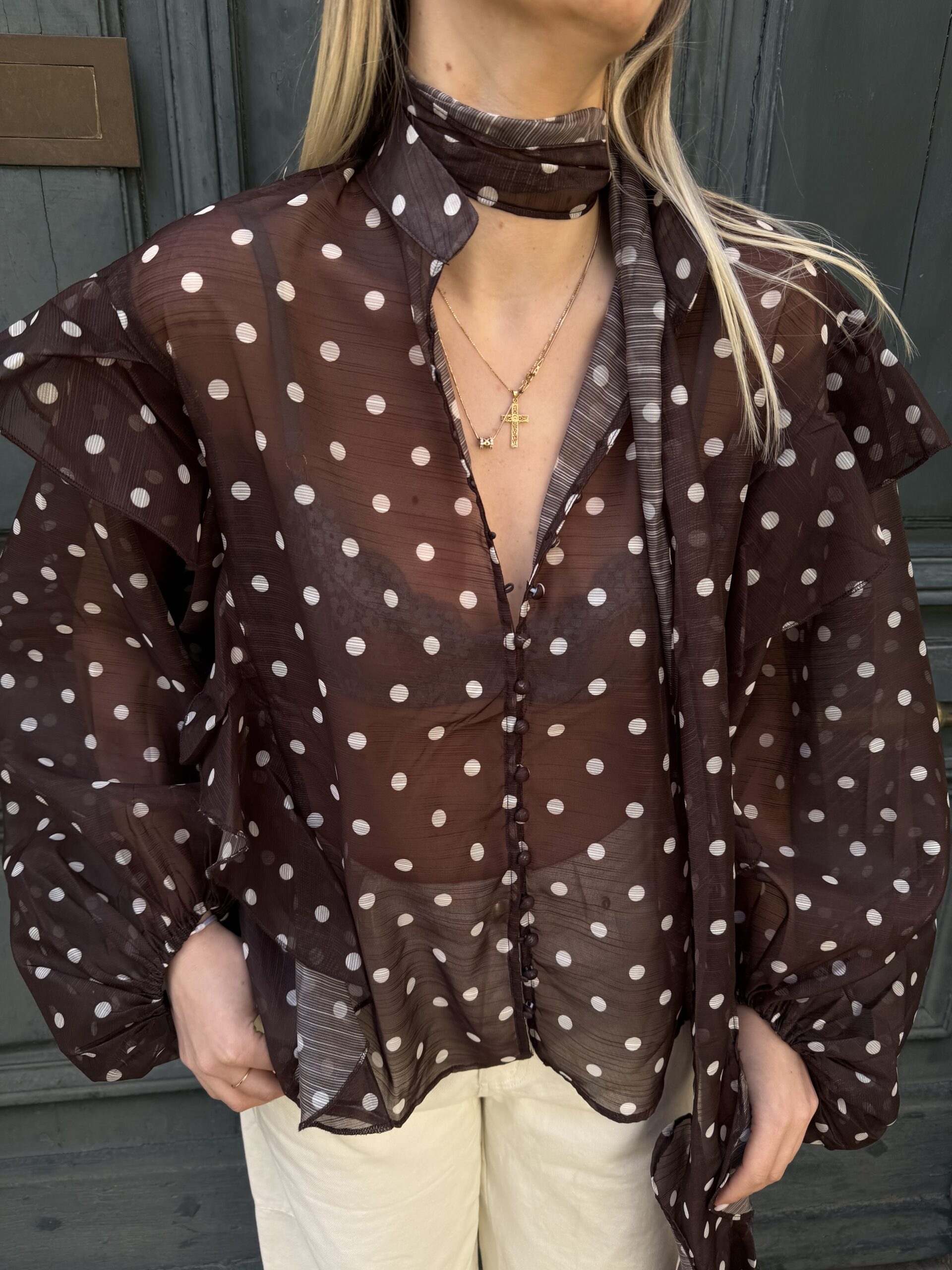 Blouse à pois écrue et marron avec tour de cou intégré, parfaite pour apporter une touche chic et féminine à vos tenues. Sa matière légère en 100% polyester la rend agréable à porter au quotidien.