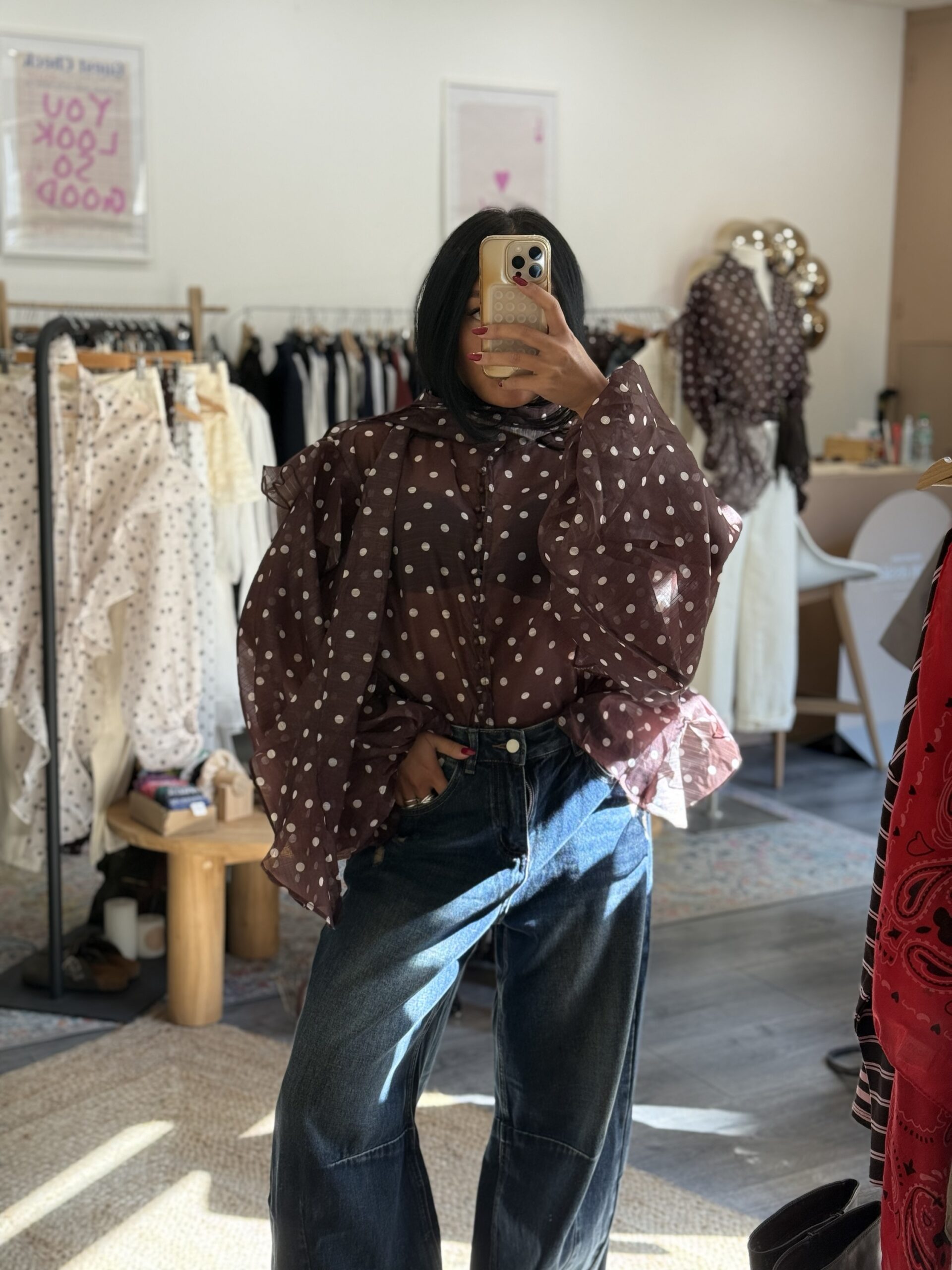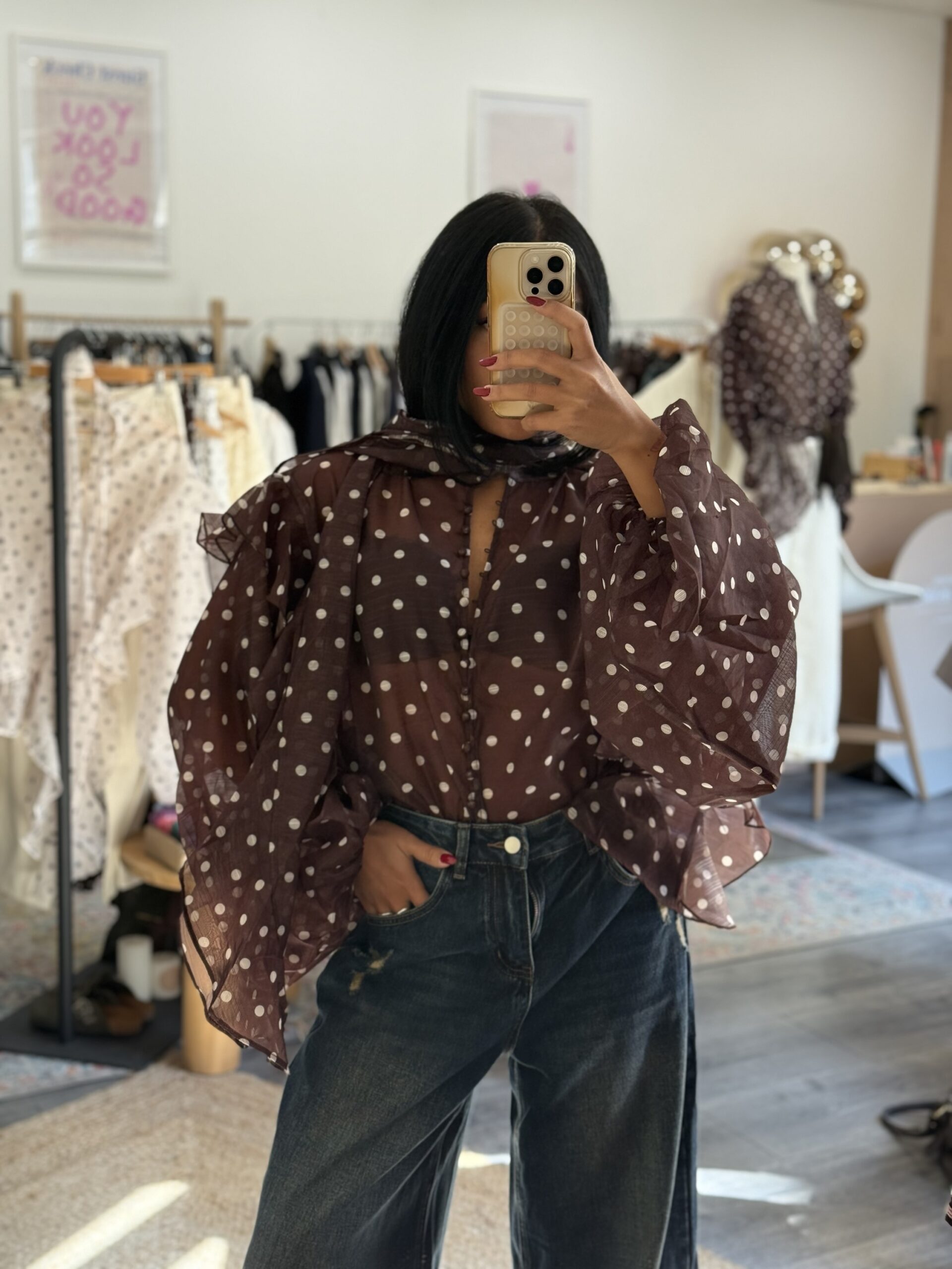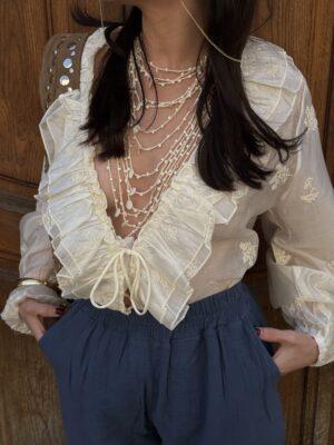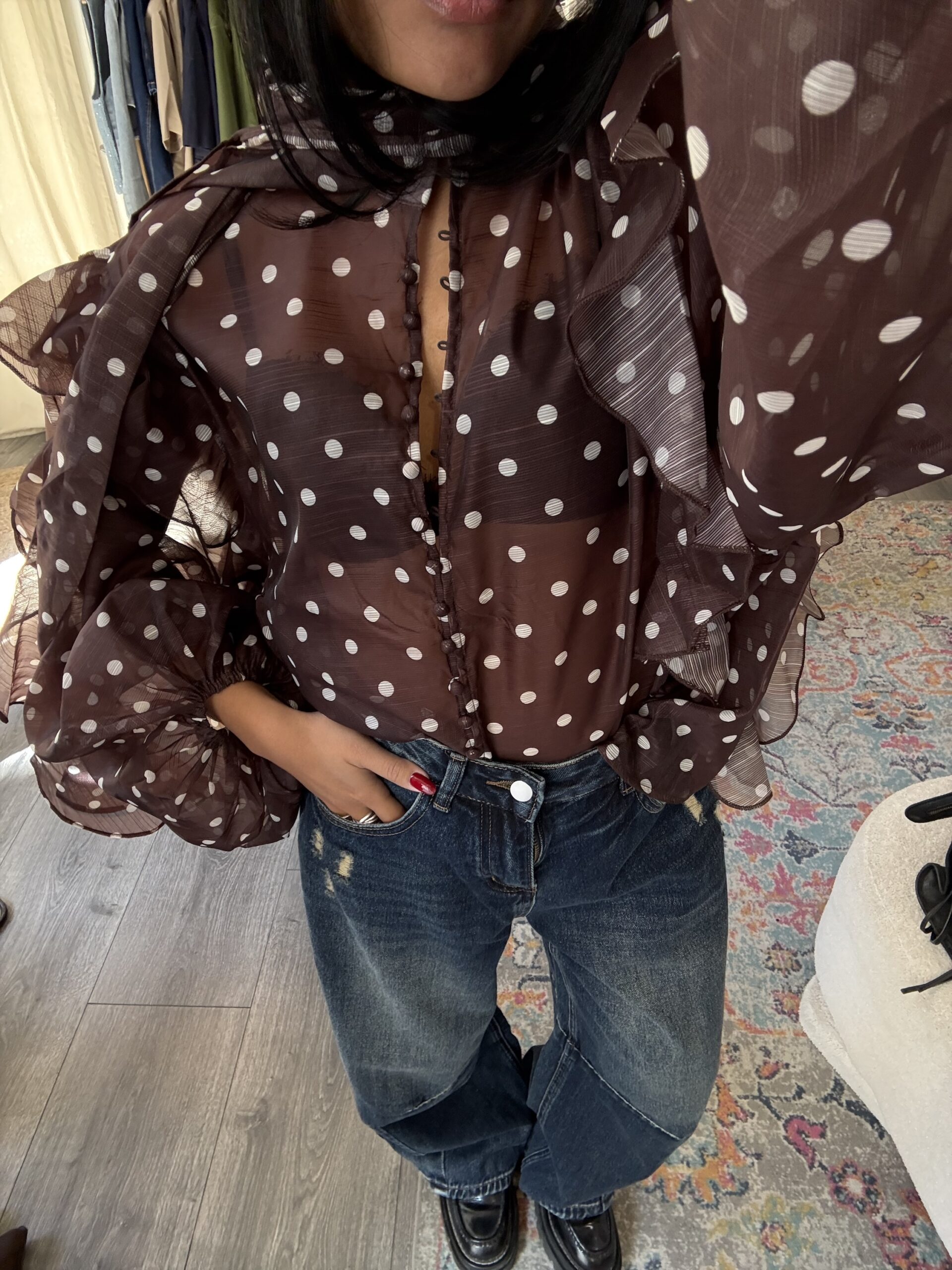 Blouse à pois écrue et marron avec tour de cou intégré, parfaite pour apporter une touche chic et féminine à vos tenues. Sa matière légère en 100% polyester la rend agréable à porter au quotidien.