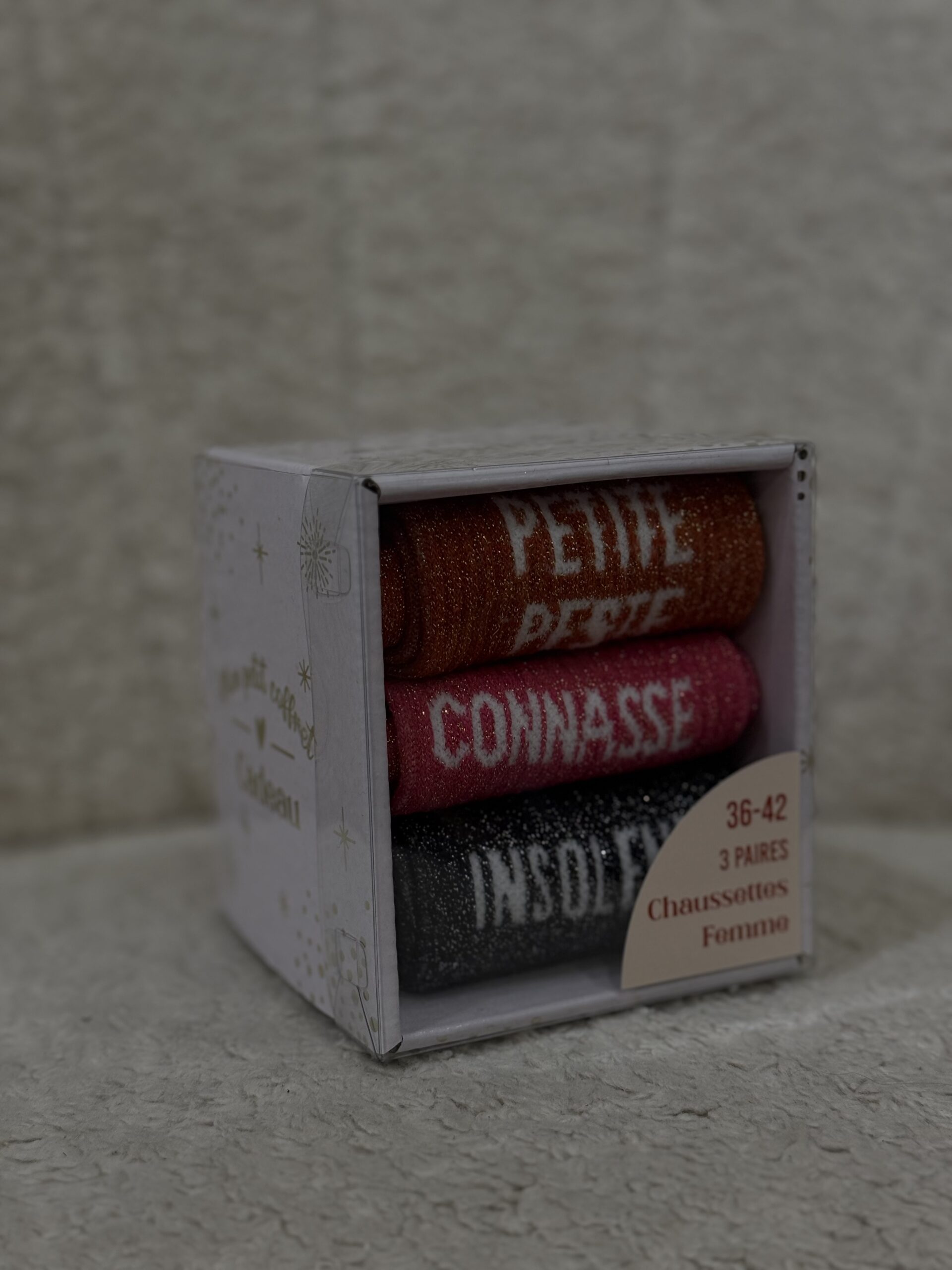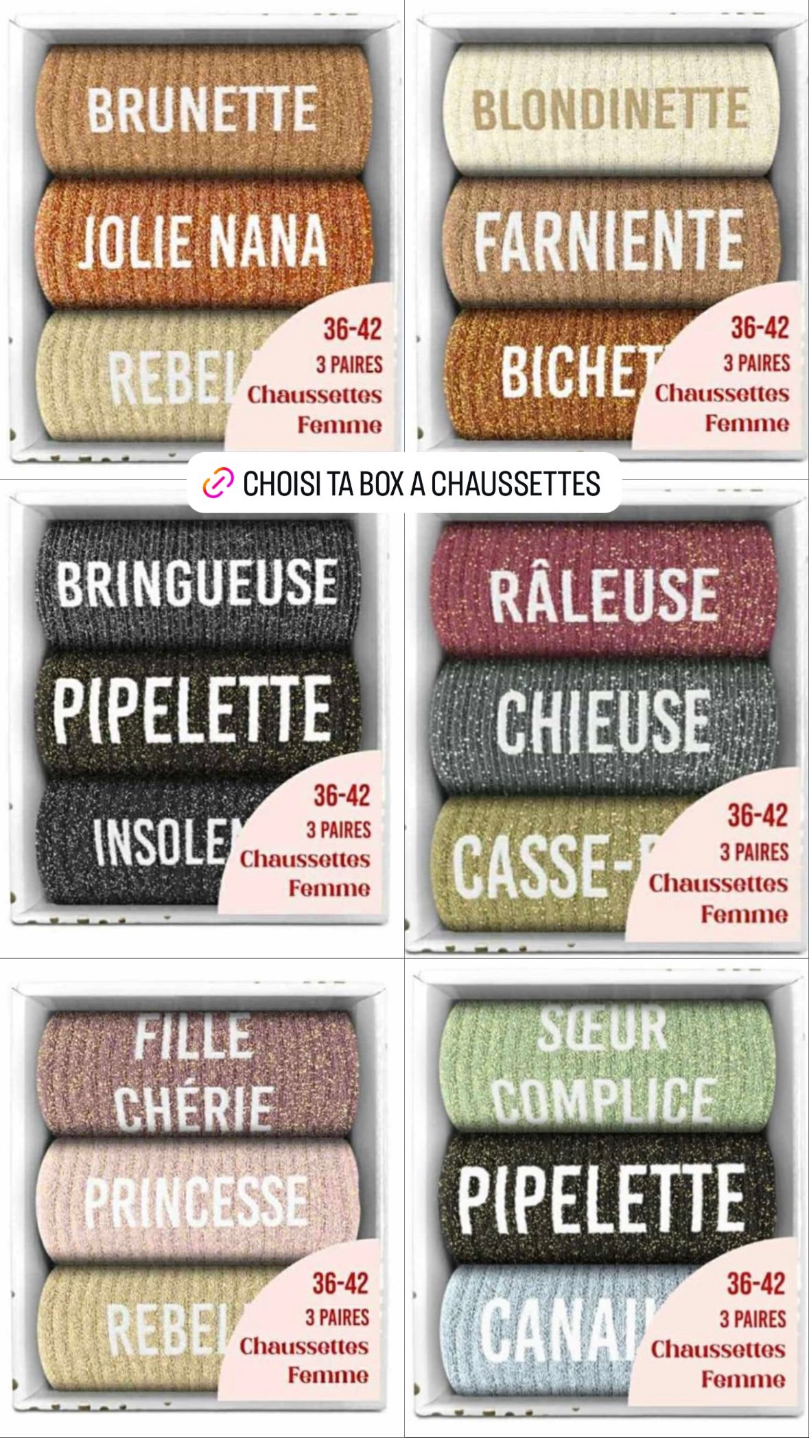 | Box standard | Fille chérie/Princesse/Rebelle, Sœur complice/ Pipelette/Canaille, Râleuse/Chieuse/Casse-Pied, Bringueuse/Pipelette/Insolente, Blondinette/Farniente/Bichette, Brunette/Jolie Nana/ Rebelle, Casse-couille/ Beau gosse/ Petit con (Homme), Petite peste / Connasse / Insolente |