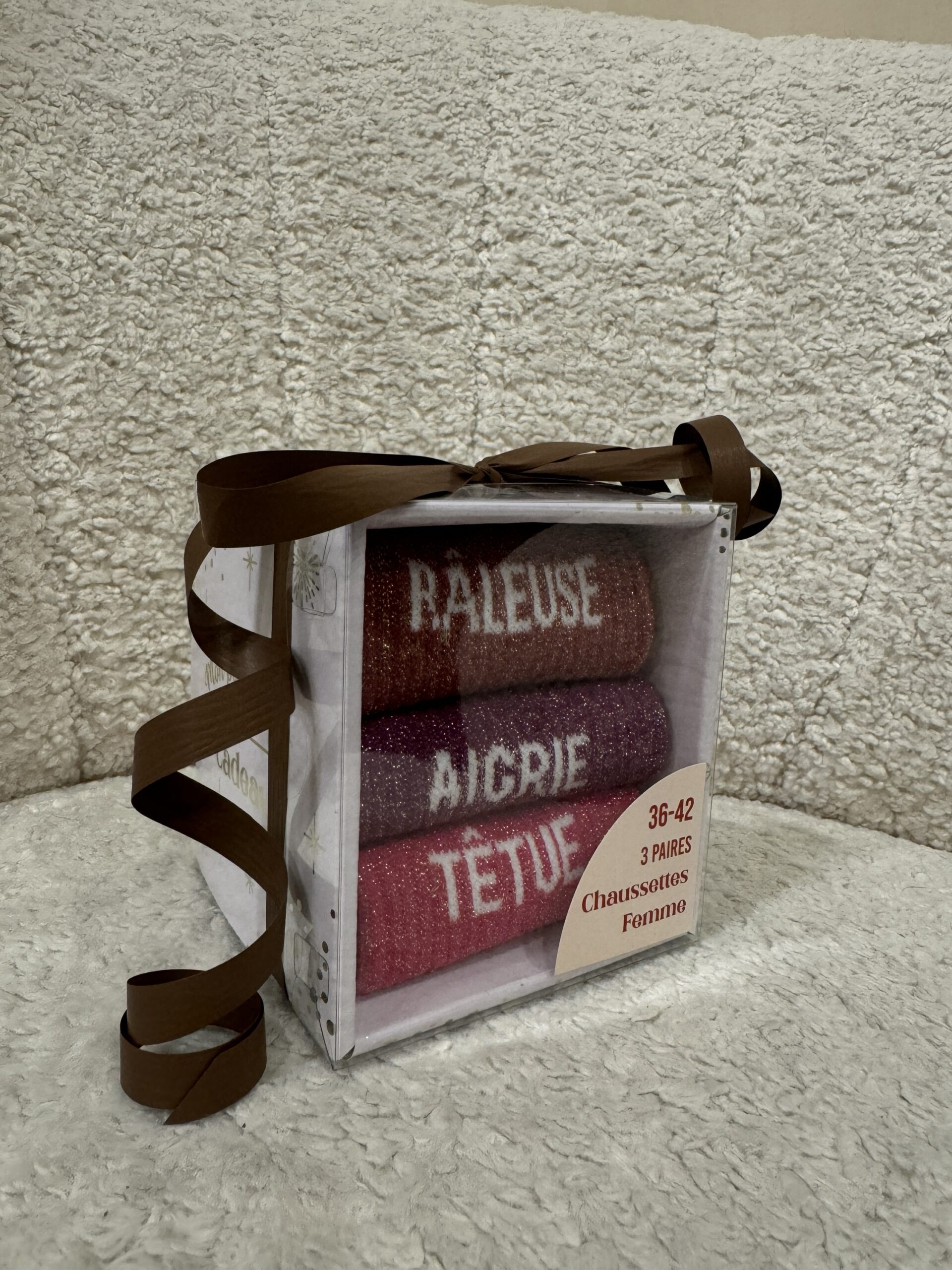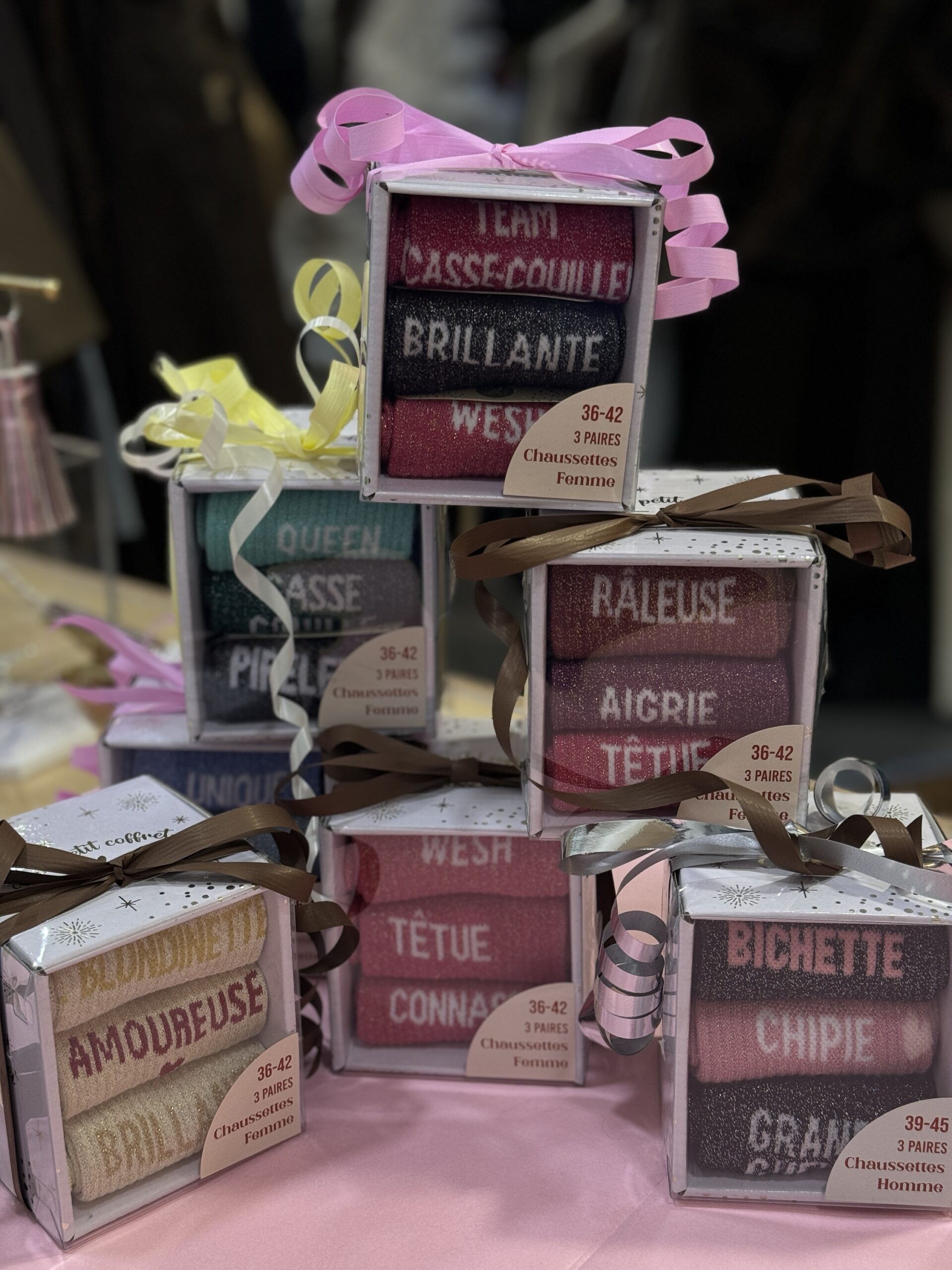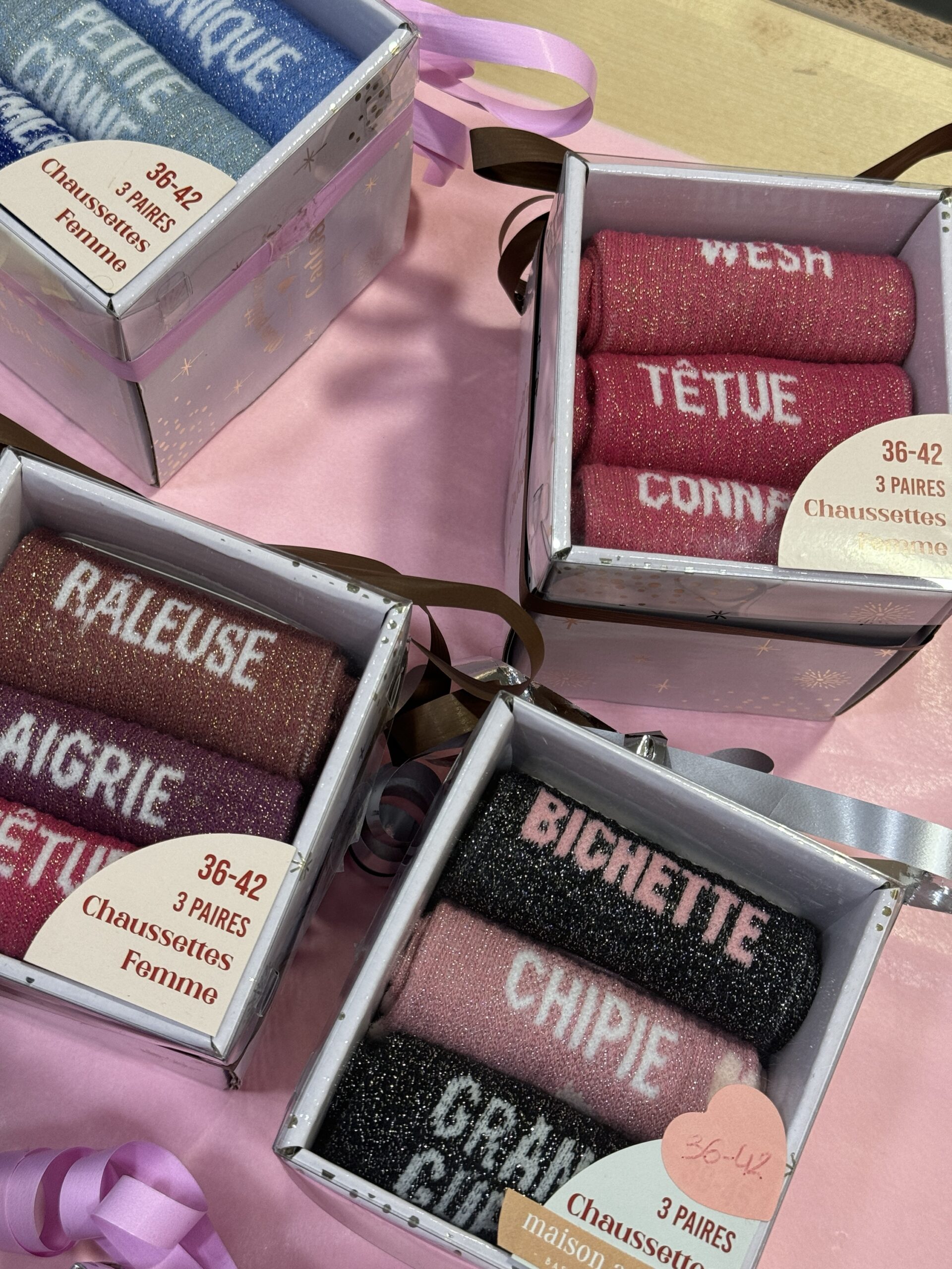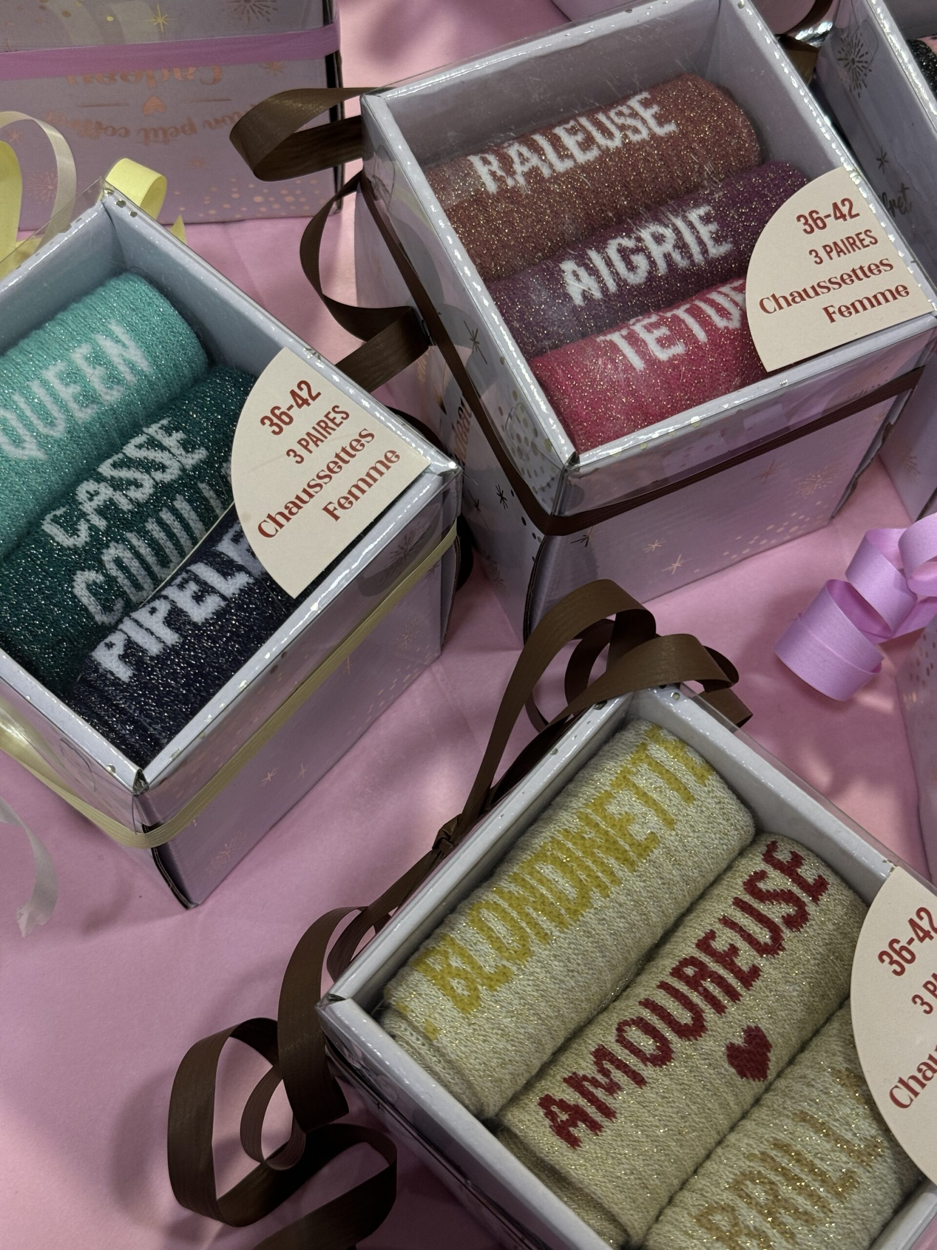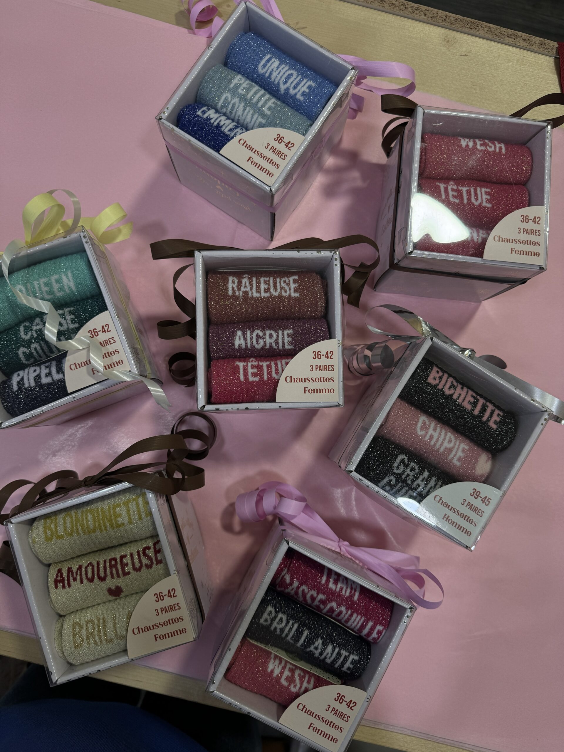 | Box standard | Fille chérie/Princesse/Rebelle, Sœur complice/ Pipelette/Canaille, Râleuse/Chieuse/Casse-Pied, Bringueuse/Pipelette/Insolente, Blondinette/Farniente/Bichette, Brunette/Jolie Nana/ Rebelle, Casse-couille/ Beau gosse/ Petit con (Homme), Petite peste / Connasse / Insolente, Diva/Quenn/Team casse-couille, Team casse-couille/Brillante & Insolente/Wesh, Queen/Casse-couille/Pipelette, Râleuse/Aigrie/Têtue, Blondinette/Amoureuse/Brillante, Wesh/Têtue/Connasse, Bichette/Chipie/Grande gueule, Petite conne/Unique/Emmerdeuse |