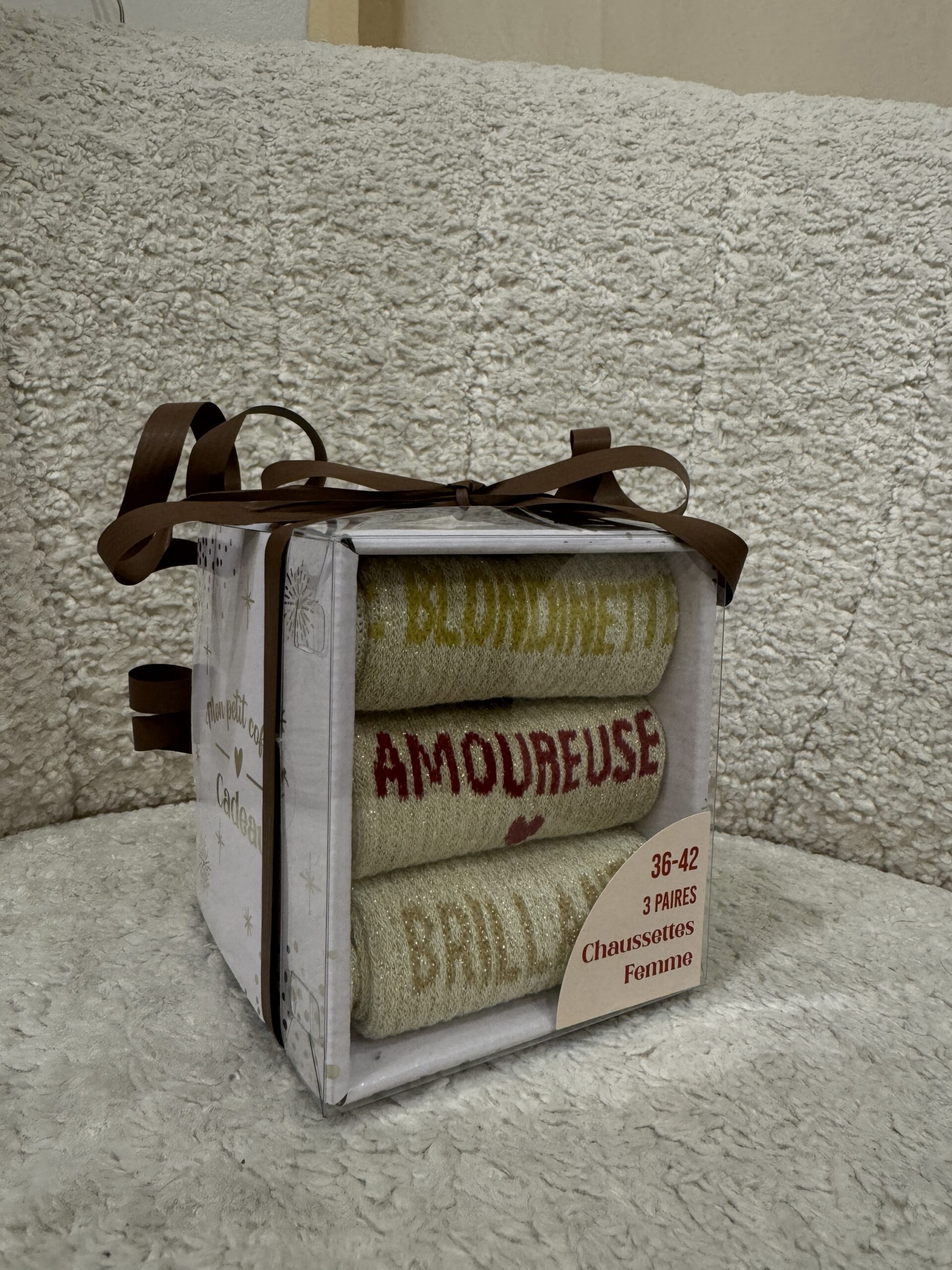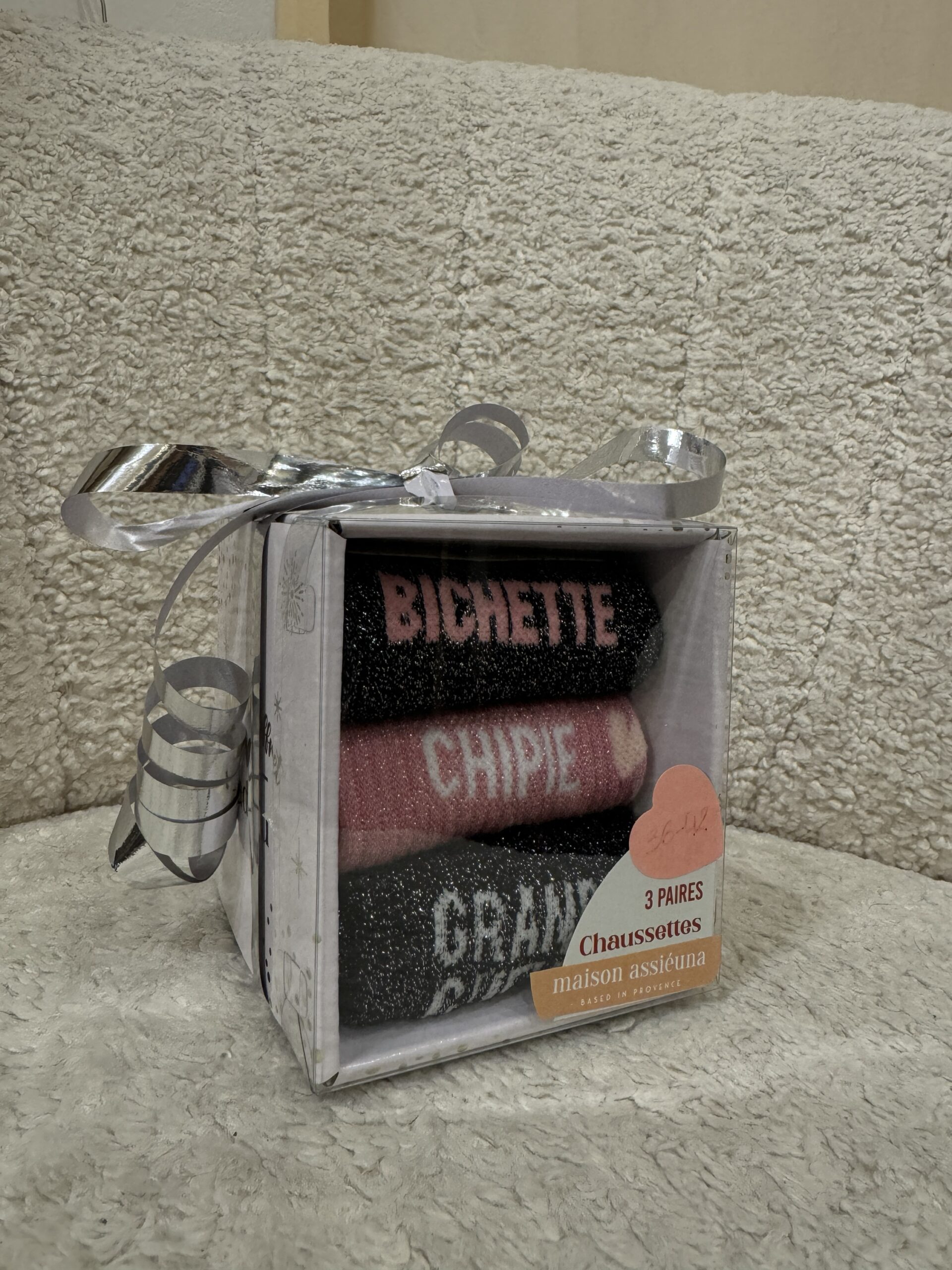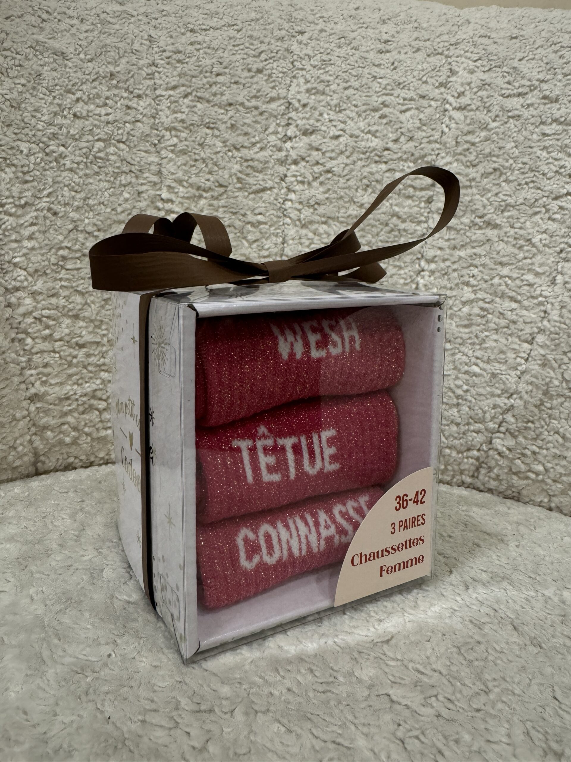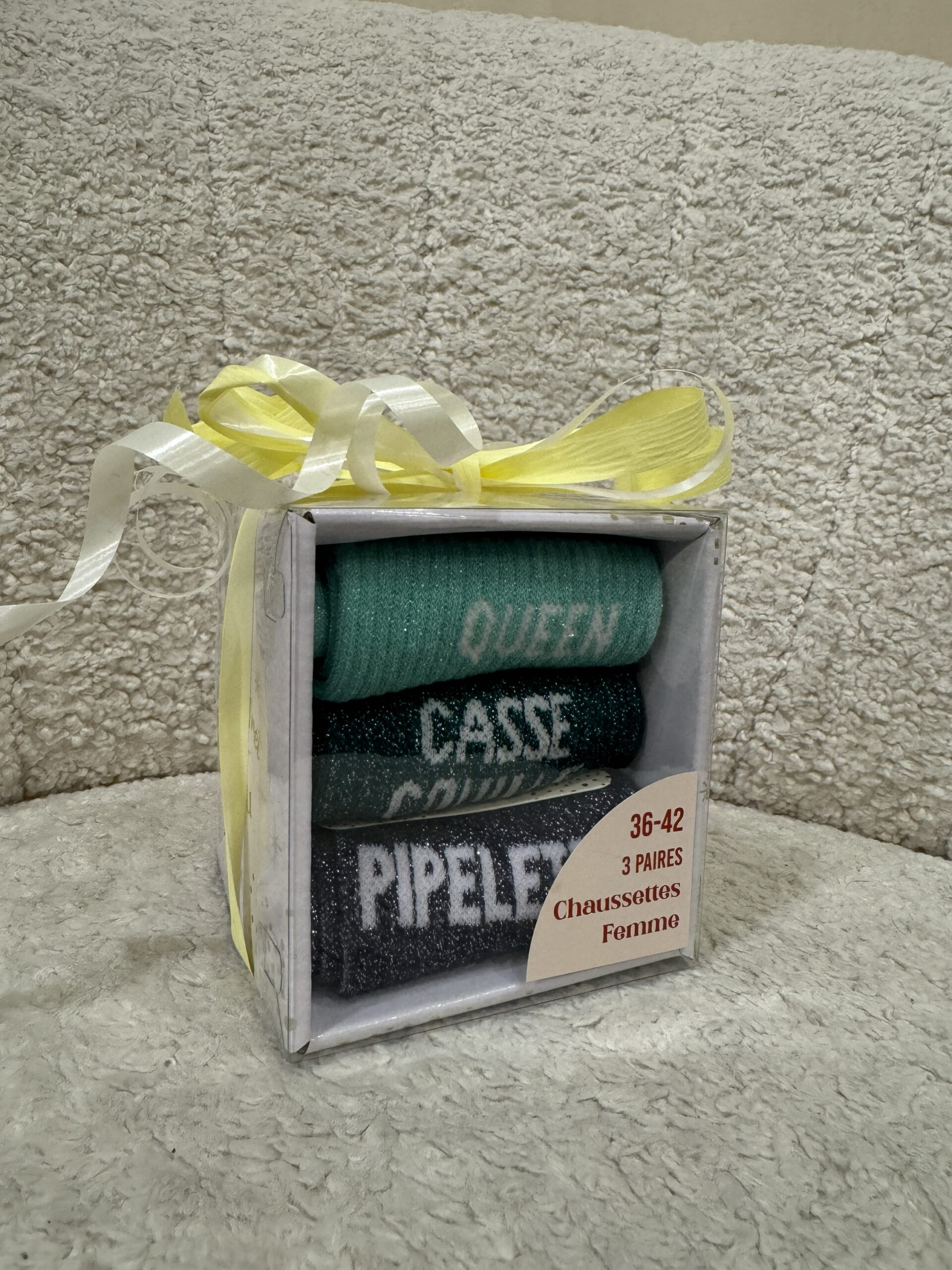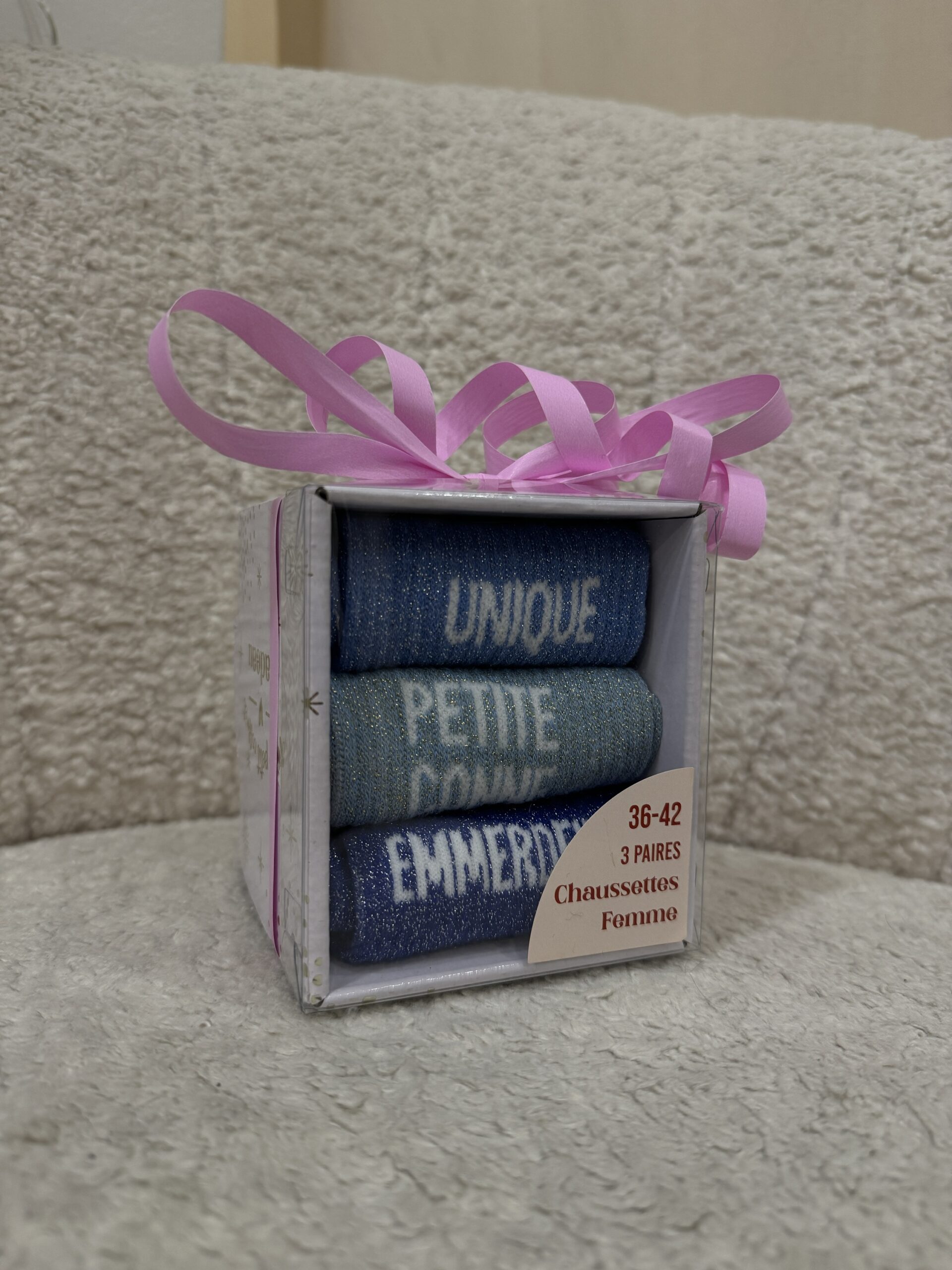 | Box standard | Fille chérie/Princesse/Rebelle, Sœur complice/ Pipelette/Canaille, Râleuse/Chieuse/Casse-Pied, Bringueuse/Pipelette/Insolente, Blondinette/Farniente/Bichette, Brunette/Jolie Nana/ Rebelle, Casse-couille/ Beau gosse/ Petit con (Homme), Petite peste / Connasse / Insolente, Diva/Quenn/Team casse-couille, Team casse-couille/Brillante & Insolente/Wesh, Queen/Casse-couille/Pipelette, Râleuse/Aigrie/Têtue, Blondinette/Amoureuse/Brillante, Wesh/Têtue/Connasse, Bichette/Chipie/Grande gueule, Petite conne/Unique/Emmerdeuse |