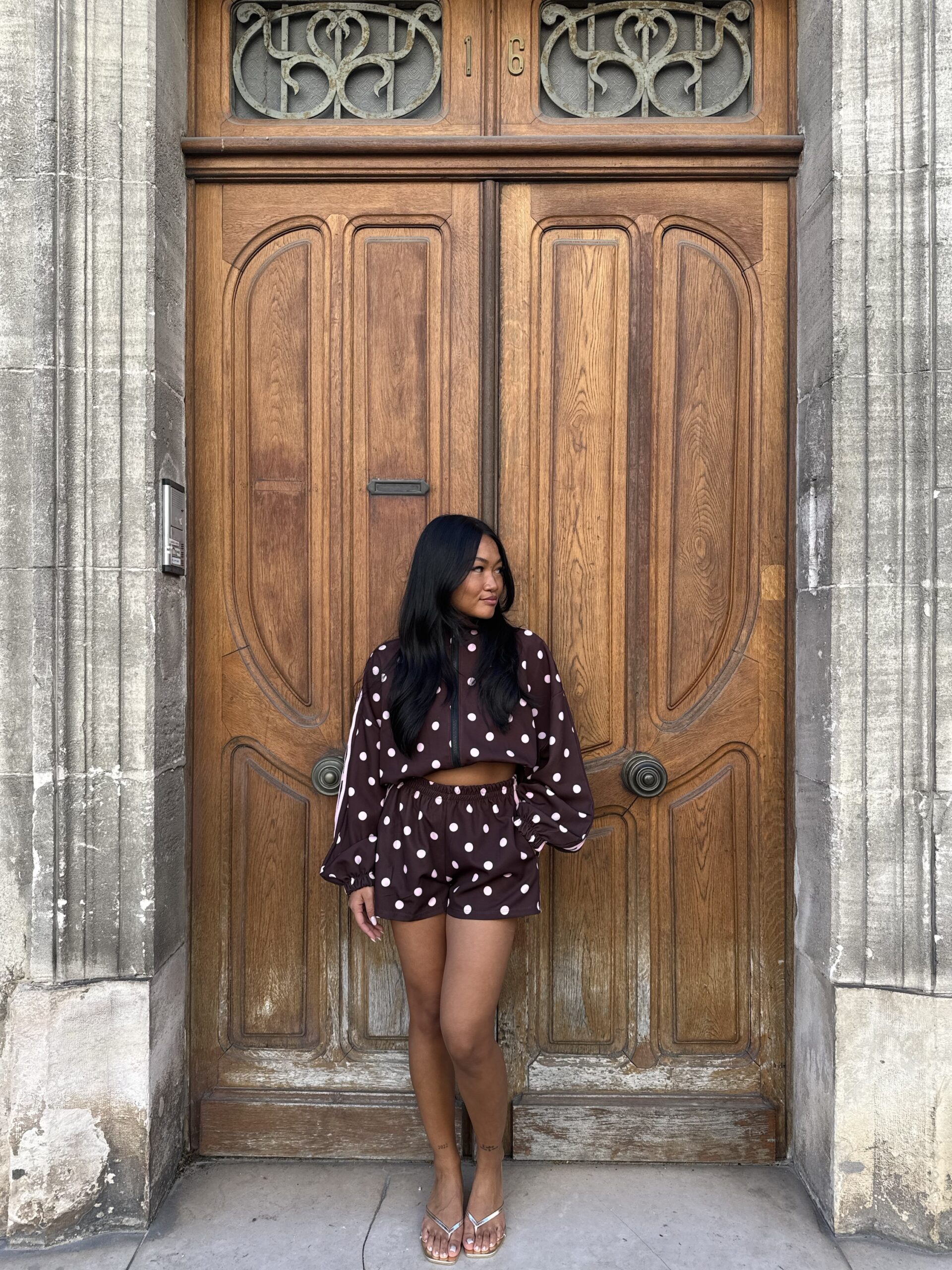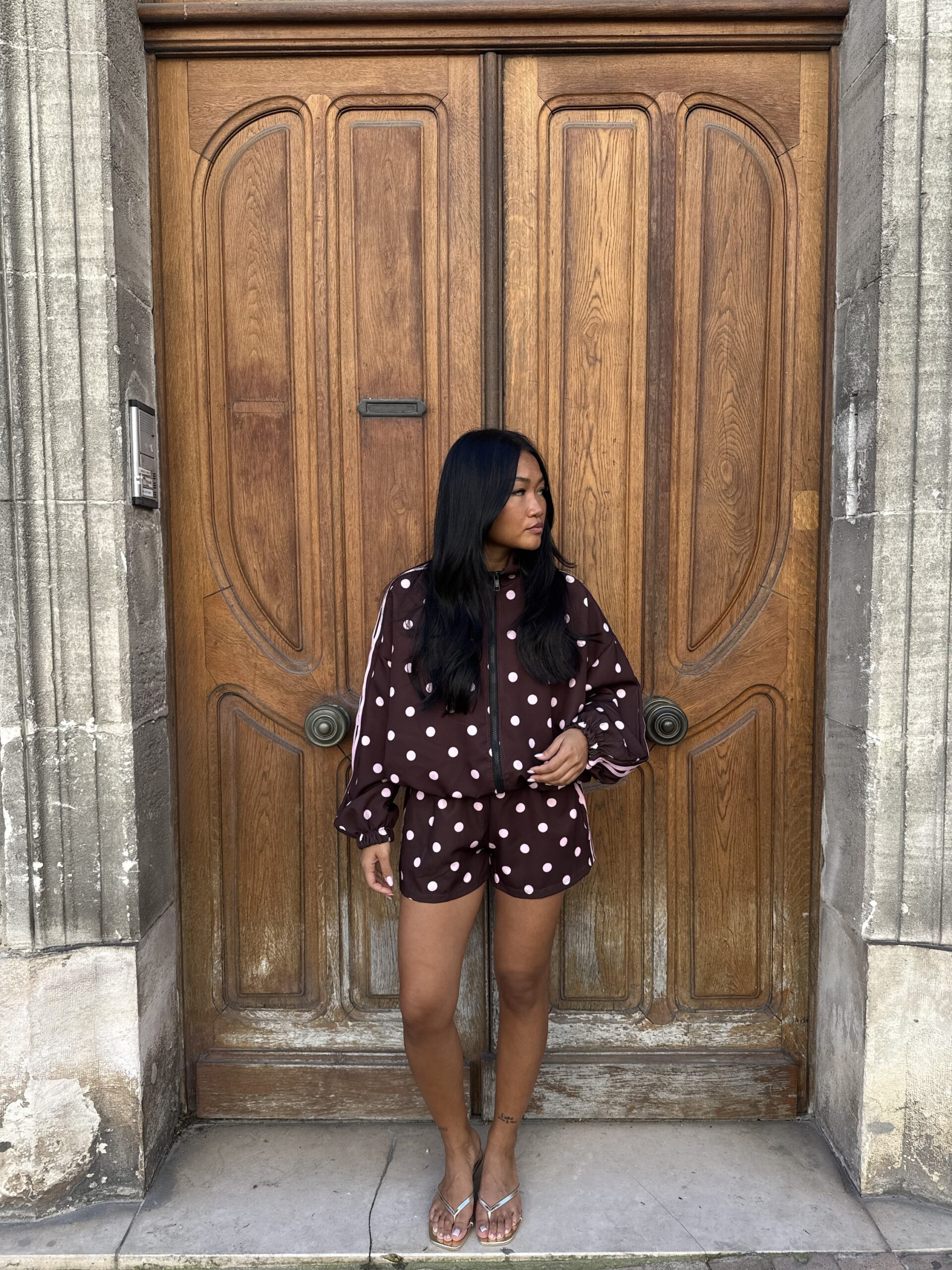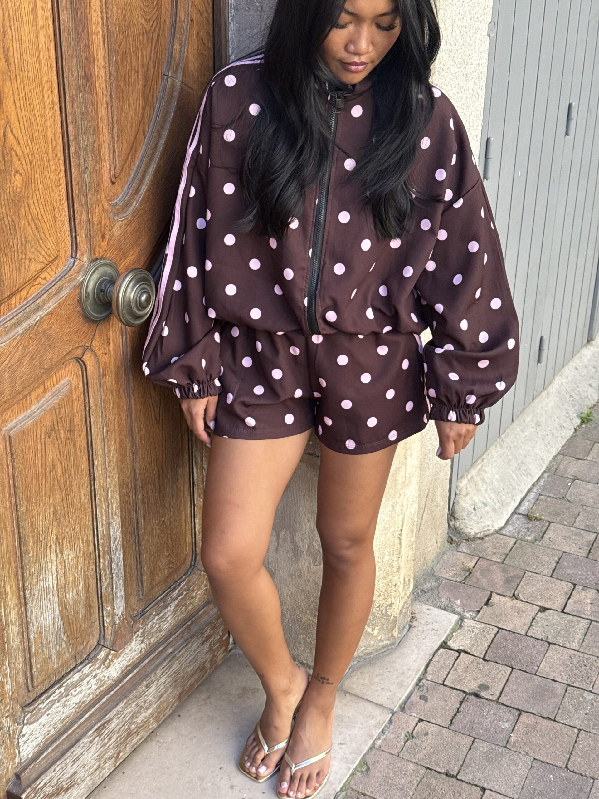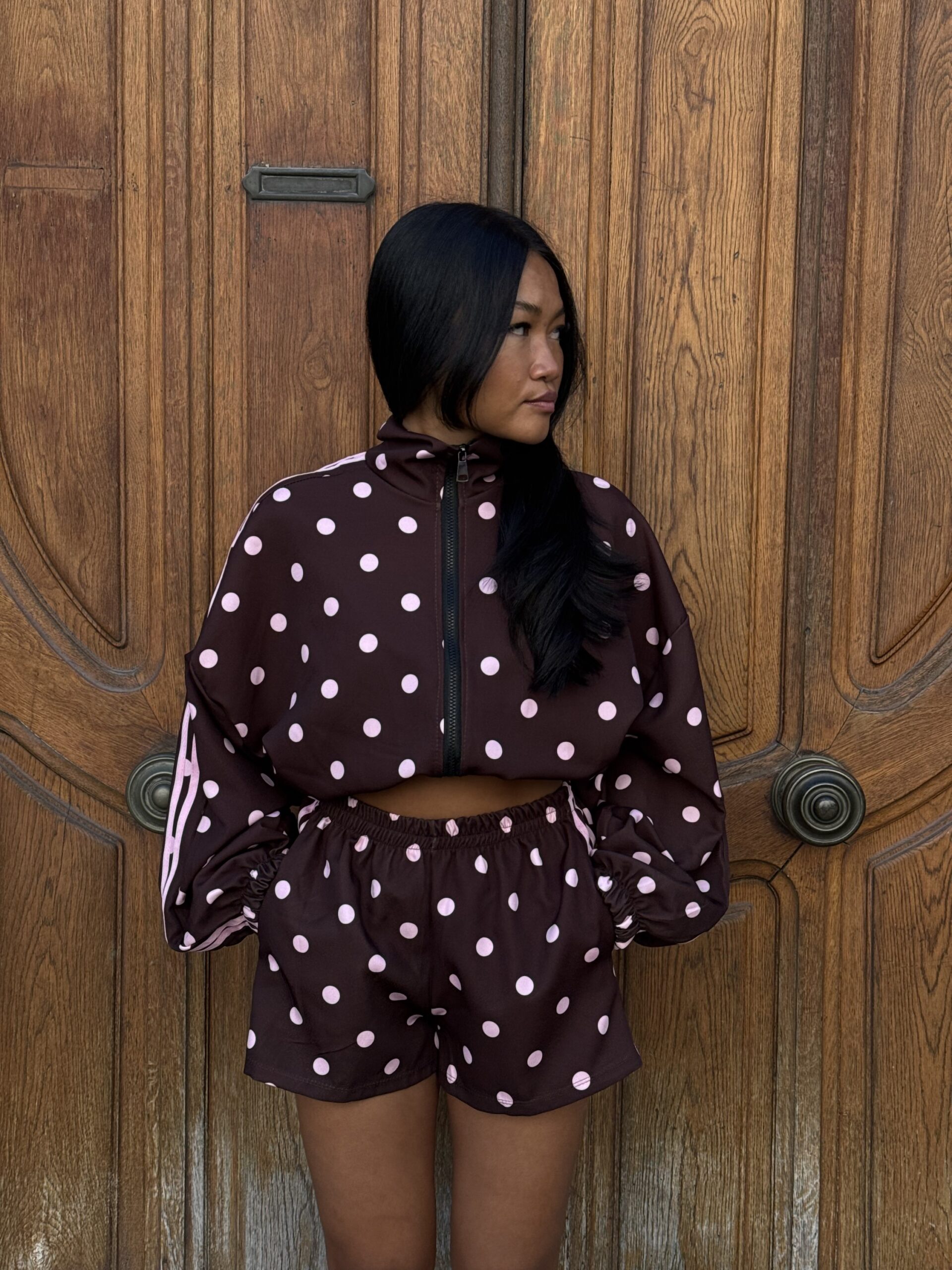 - Détails : imprimé pois et bandes roses sur la manche, poches sur la veste et le short, short avec élastique à la taille, bord côte sur la veste
