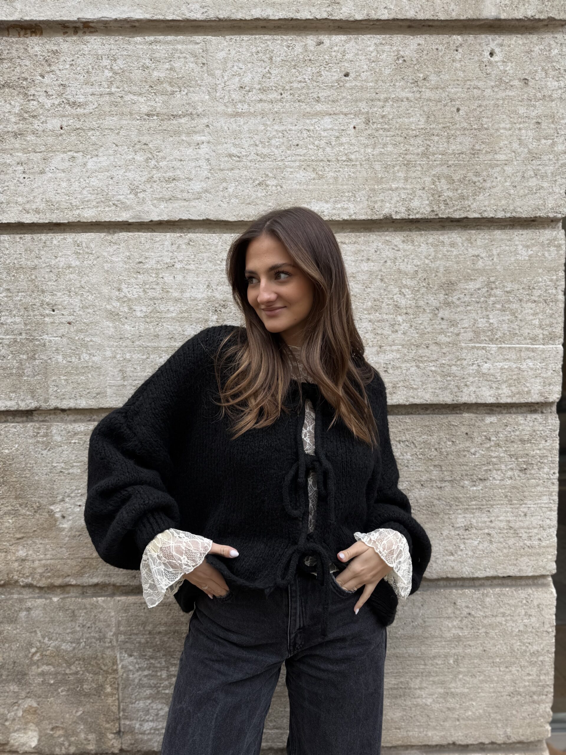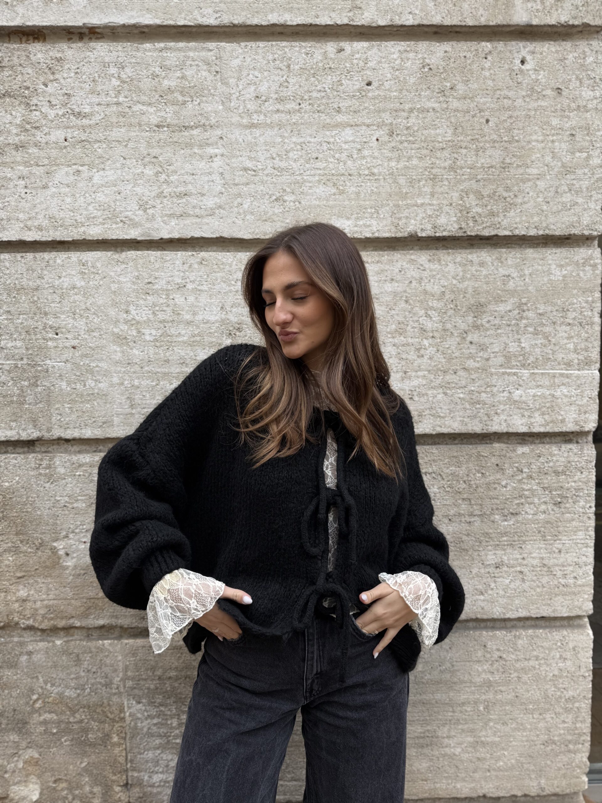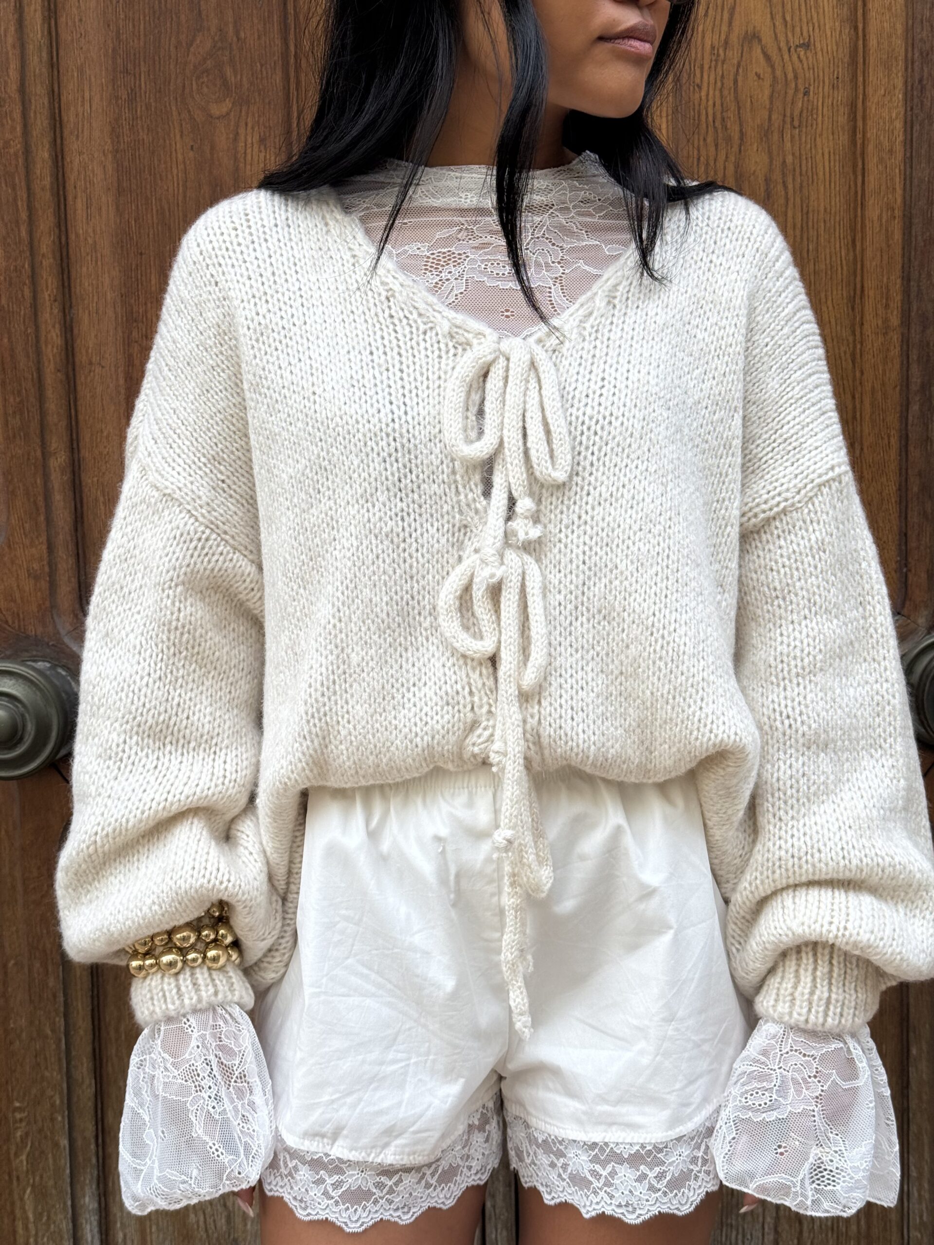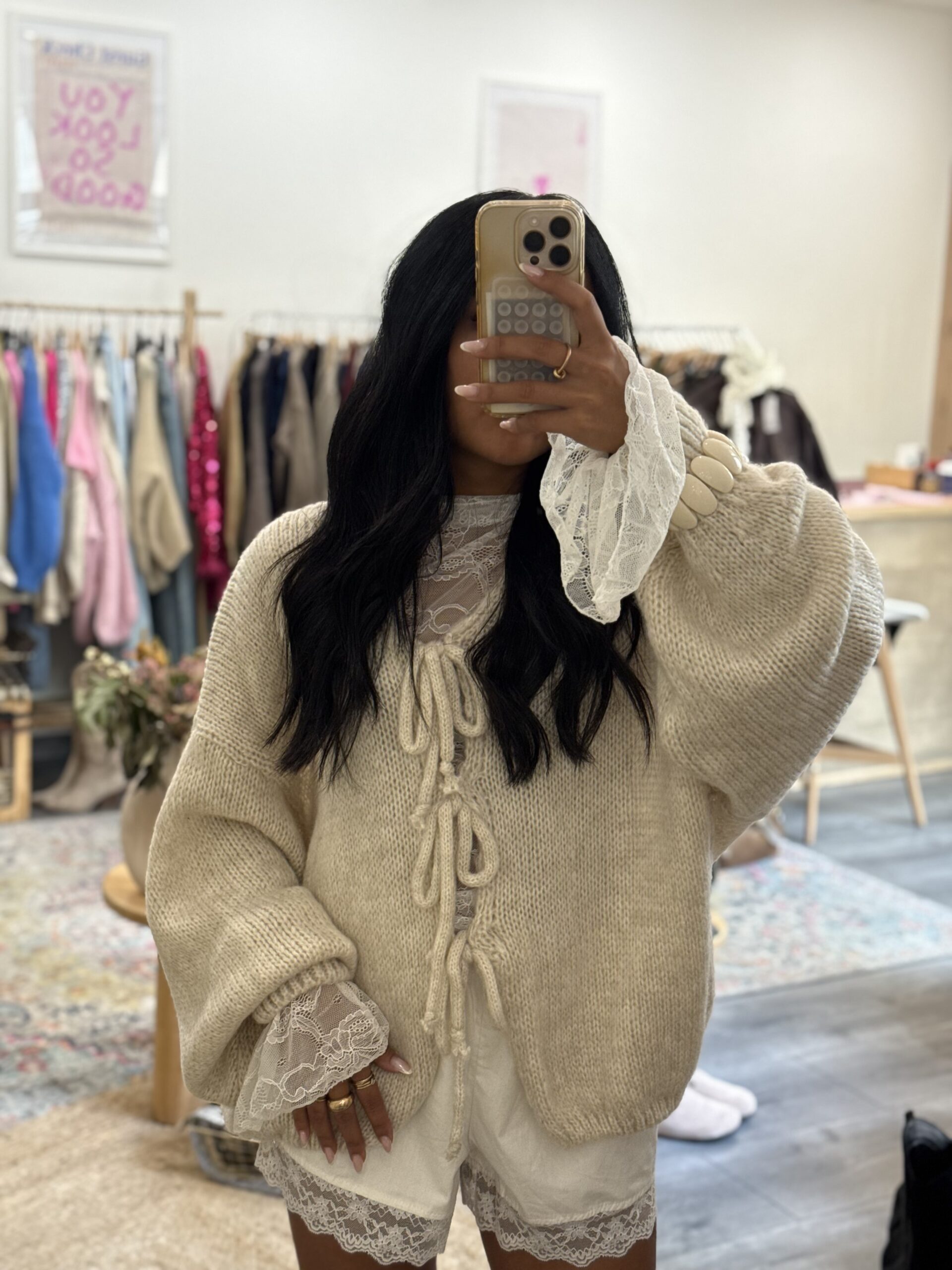 Gilet tout doux triple noeud à nouer ou non! Nous portons le gilet avec un top dentelle ANNIE ainsi que des bijoux, short et Santiago de la boutique pour un total look canon