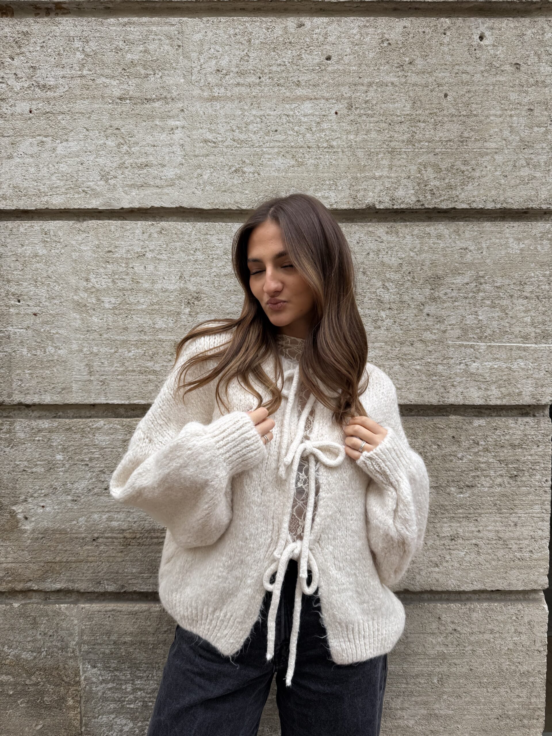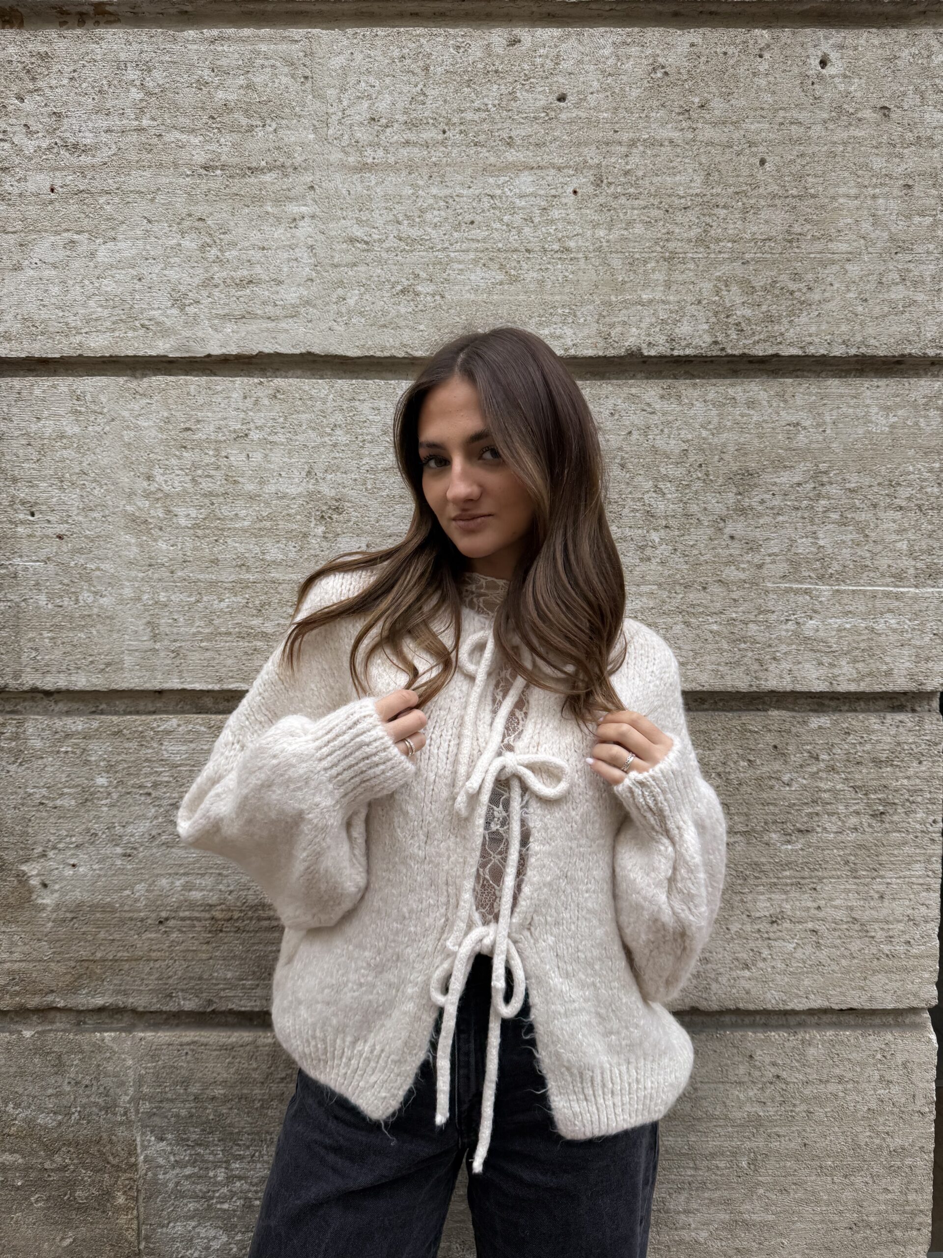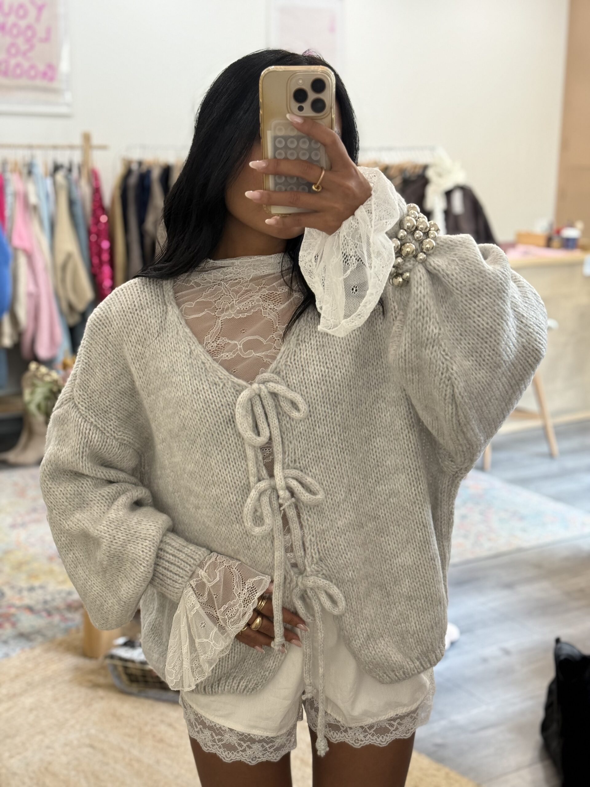 Gilet tout doux triple noeud à nouer ou non! Nous portons le gilet avec un top dentelle ANNIE ainsi que des bijoux, short et Santiago de la boutique pour un total look canon