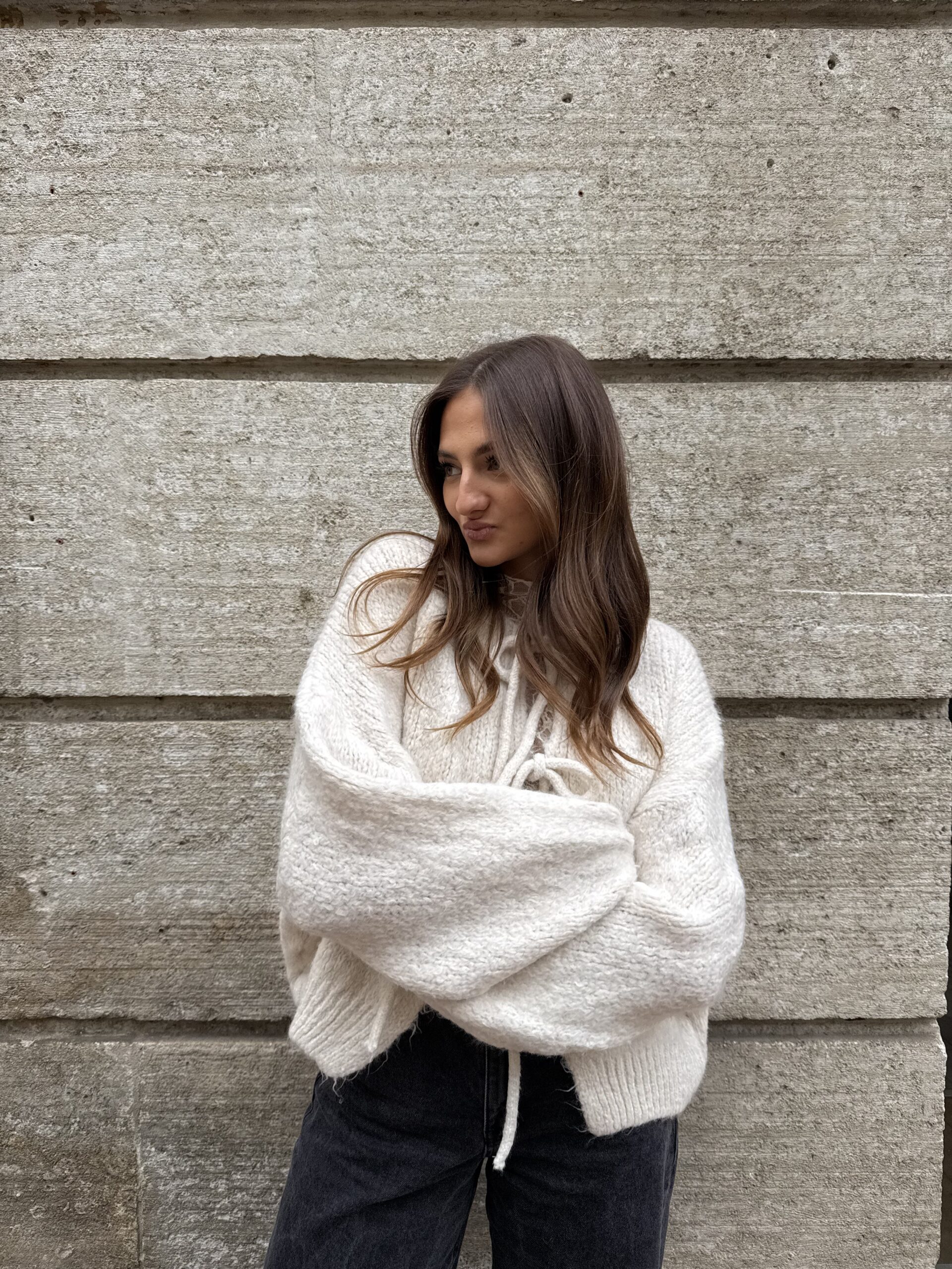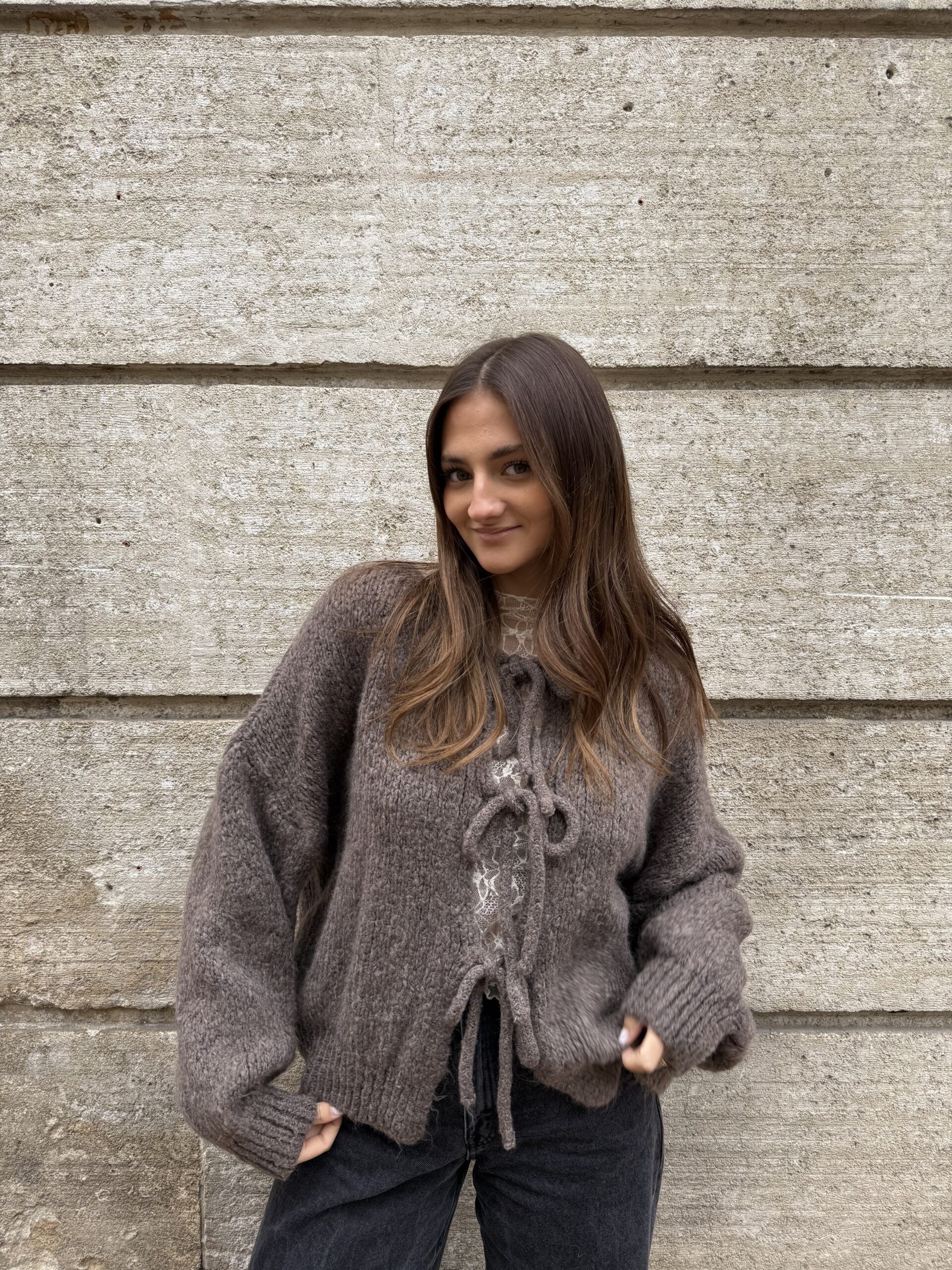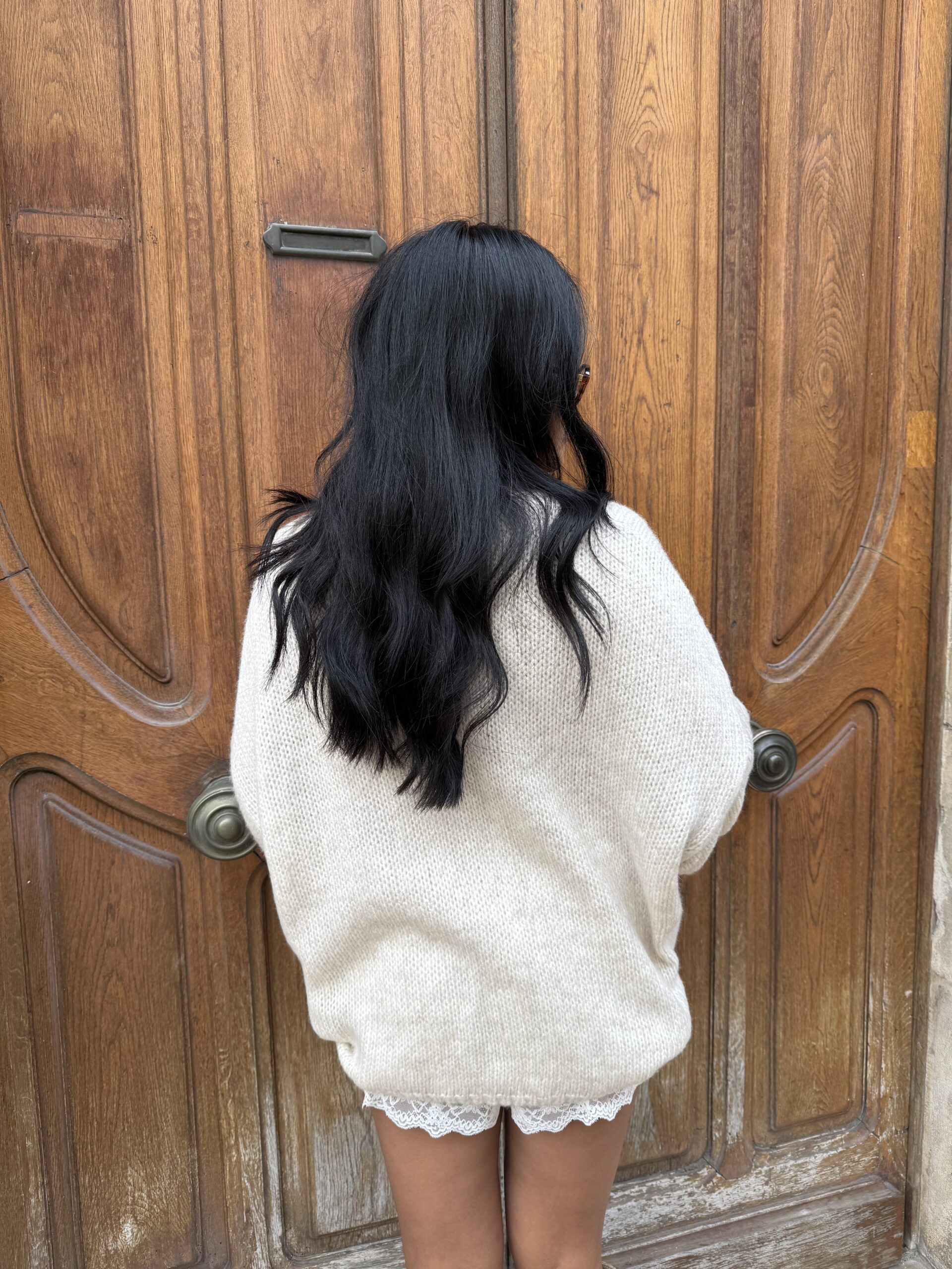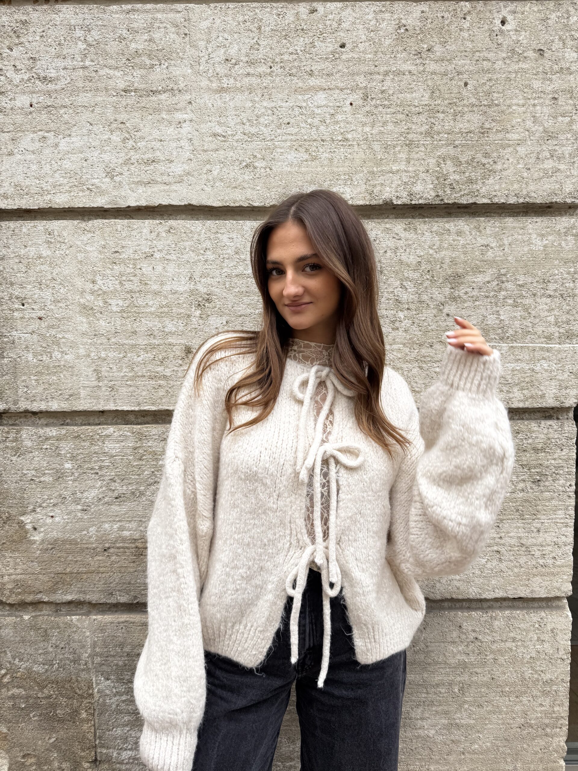 Gilet tout doux triple noeud à nouer ou non! Nous portons le gilet avec un top dentelle ANNIE ainsi que des bijoux, short et Santiago de la boutique pour un total look canon