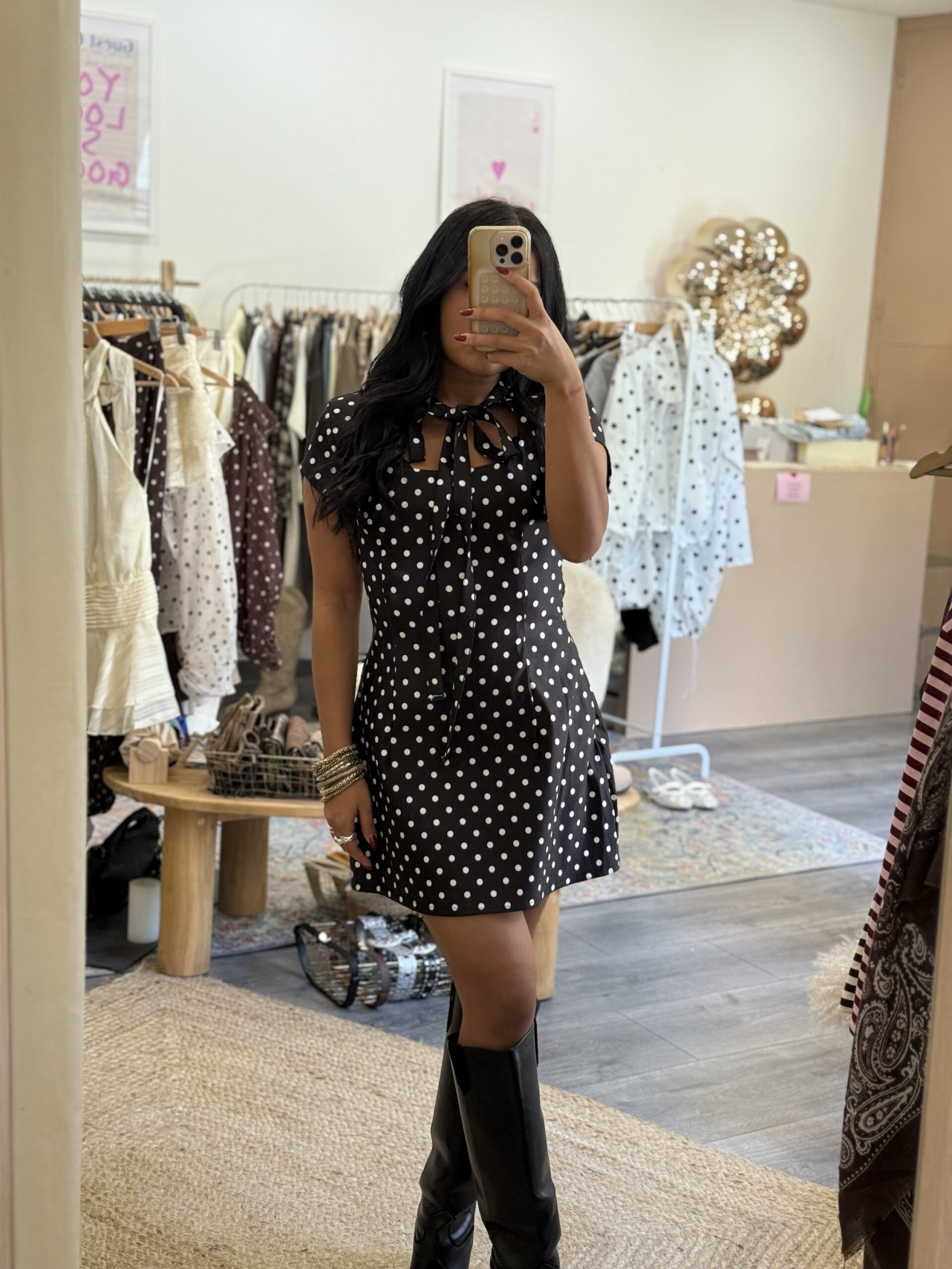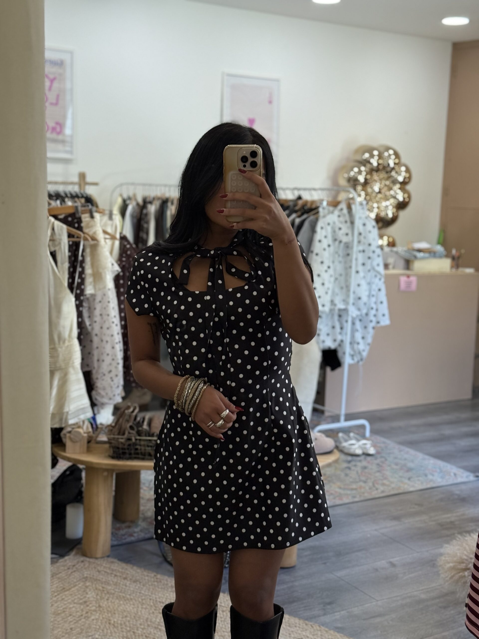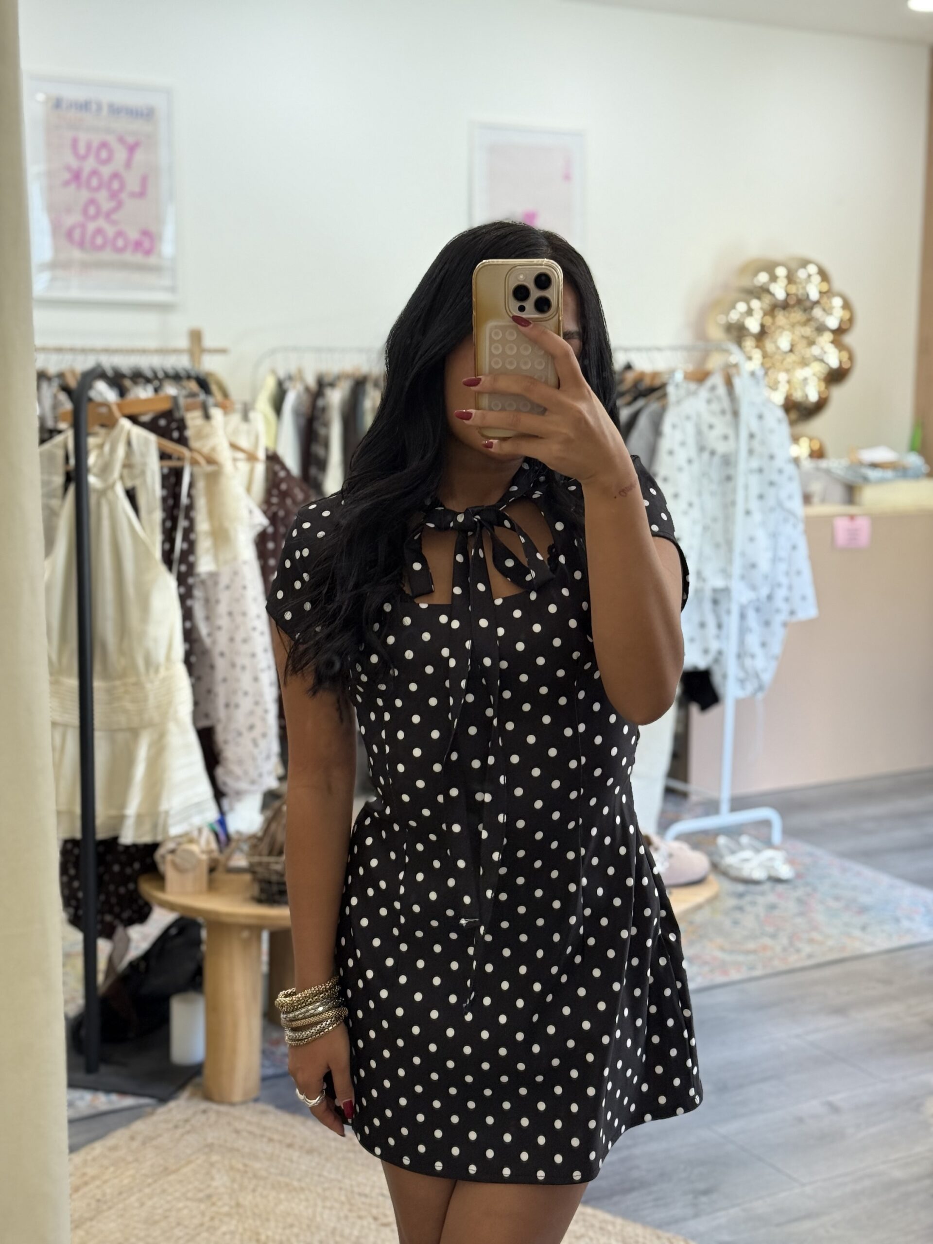 Adoptez cette robe courte à pois avec nœud, féminine et tendance. Sa coupe flatteuse met en valeur la silhouette et sa taille unique (XS à L) convient à toutes. Disponible en noir à pois blancs et blanc à pois noirs, elle apporte une touche rétro chic et élégante à vos looks du quotidien comme aux occasions spéciales.