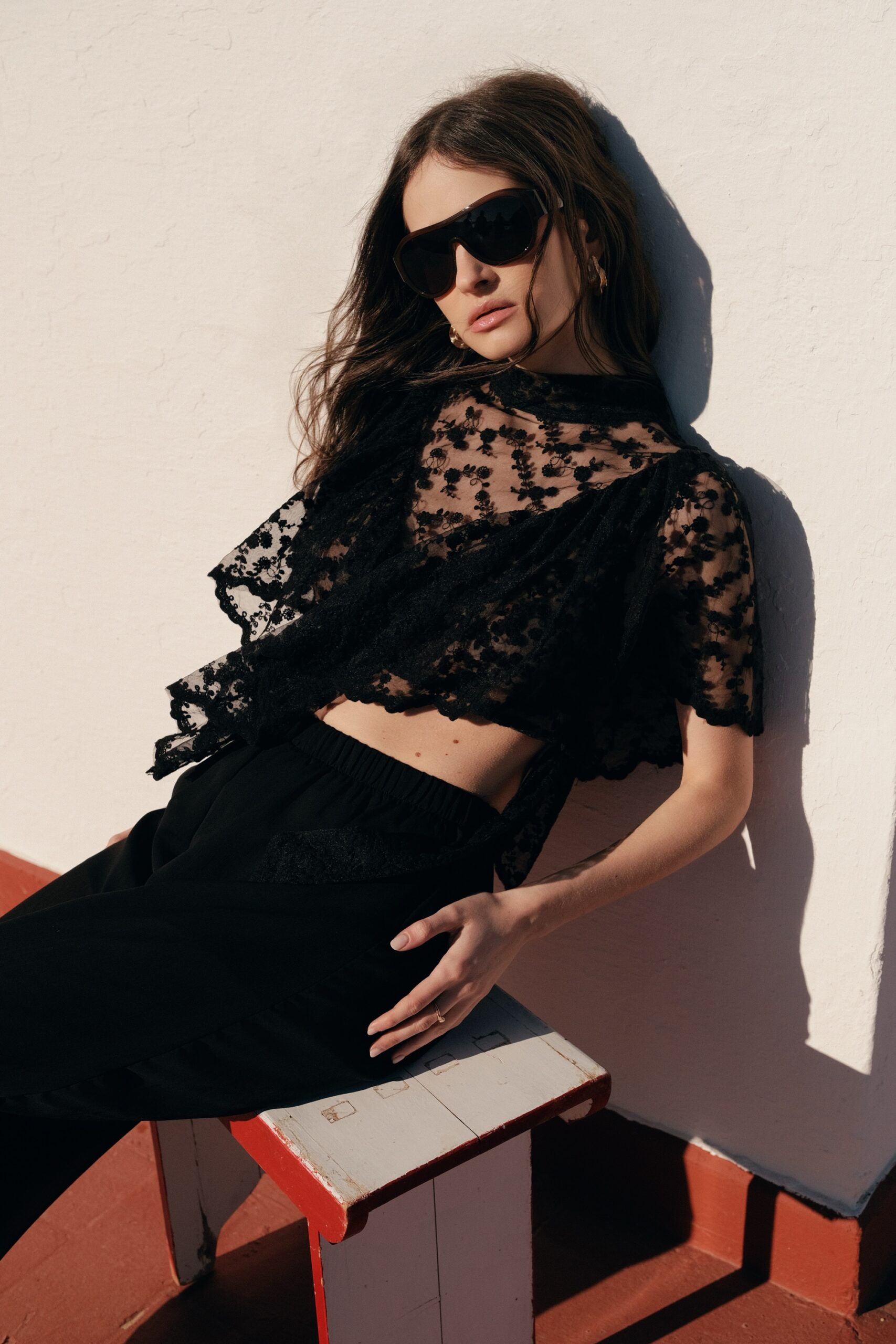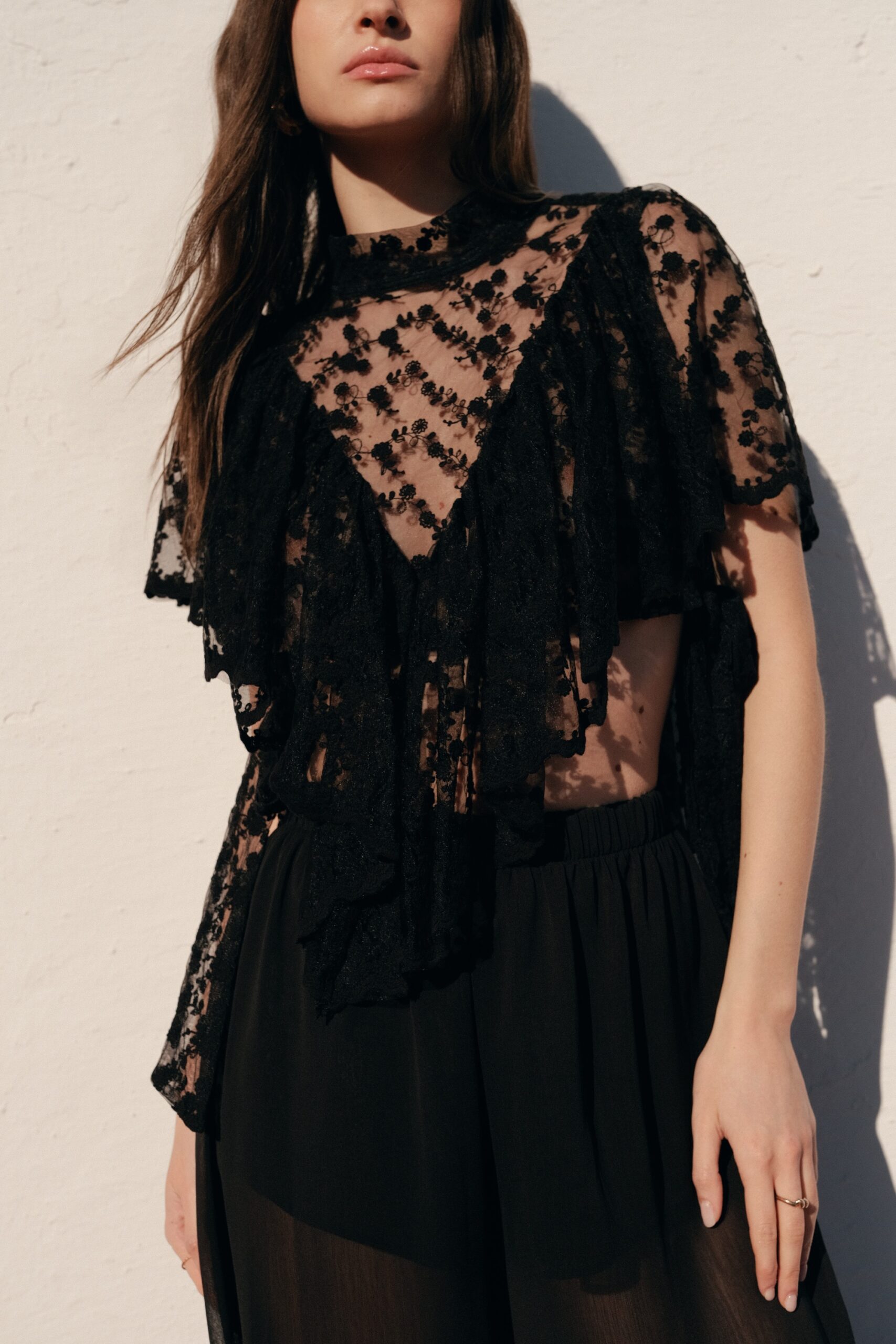 Top en dentelle blanc écru, léger et féminin, orné de volants délicats pour un effet romantique. Les liens à nouer sur les bras permettent un ajustement parfait et ajoutent une touche élégante et personnalisable. Polyvalent, il se porte aussi bien pour un look chic que bohème, idéal pour toutes les occasions.
